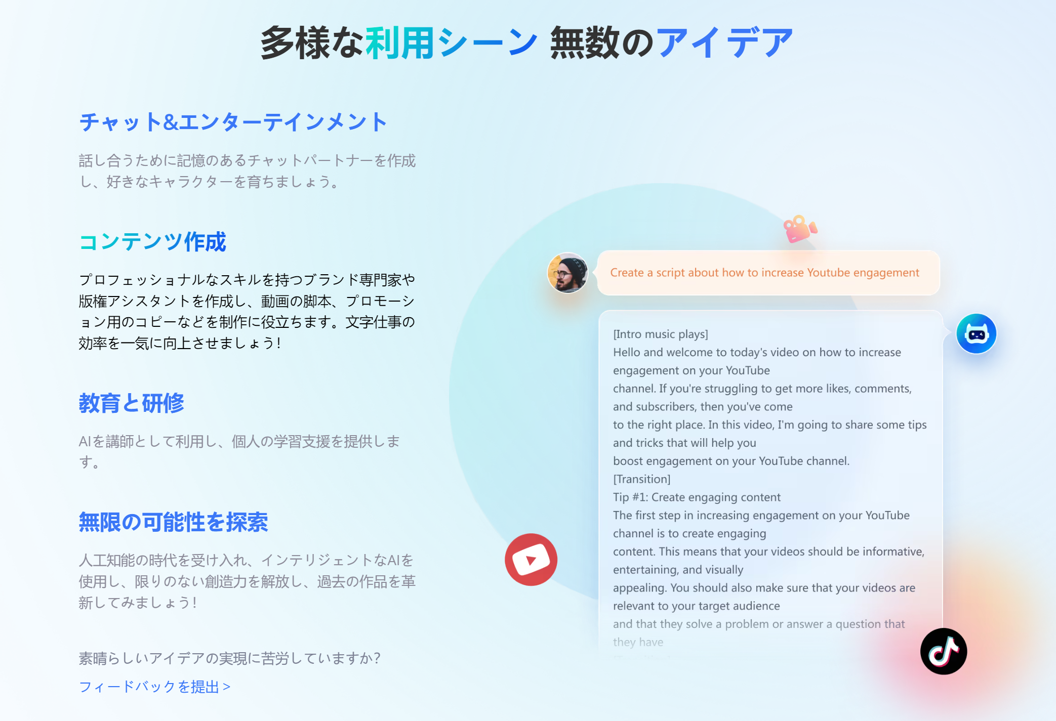 このチャットボットは、ストーリーのアウトライン、業務の要約、ソフトウェアの説明、広告スローガン、さらには動画の脚本など、さまざまなコンテンツの作成に役立ちます。この優れたツールを活用することで、より優先すべき仕事に集中しながら、時間と手間を省くことができます。