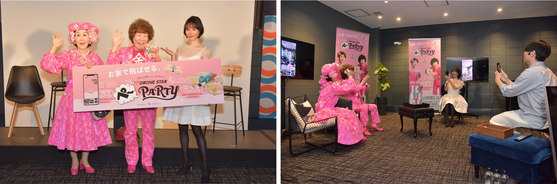 発表会では、新製品「DRONE STAR PARTY」の発表に伴い、スペシャルゲストの林家ペー・パー子夫妻、水沢アリーさんより、「DRONE STAR PARTY」を使用してみた感想や、ドローンで撮影してみたいことなどトークセッションを実施しました。