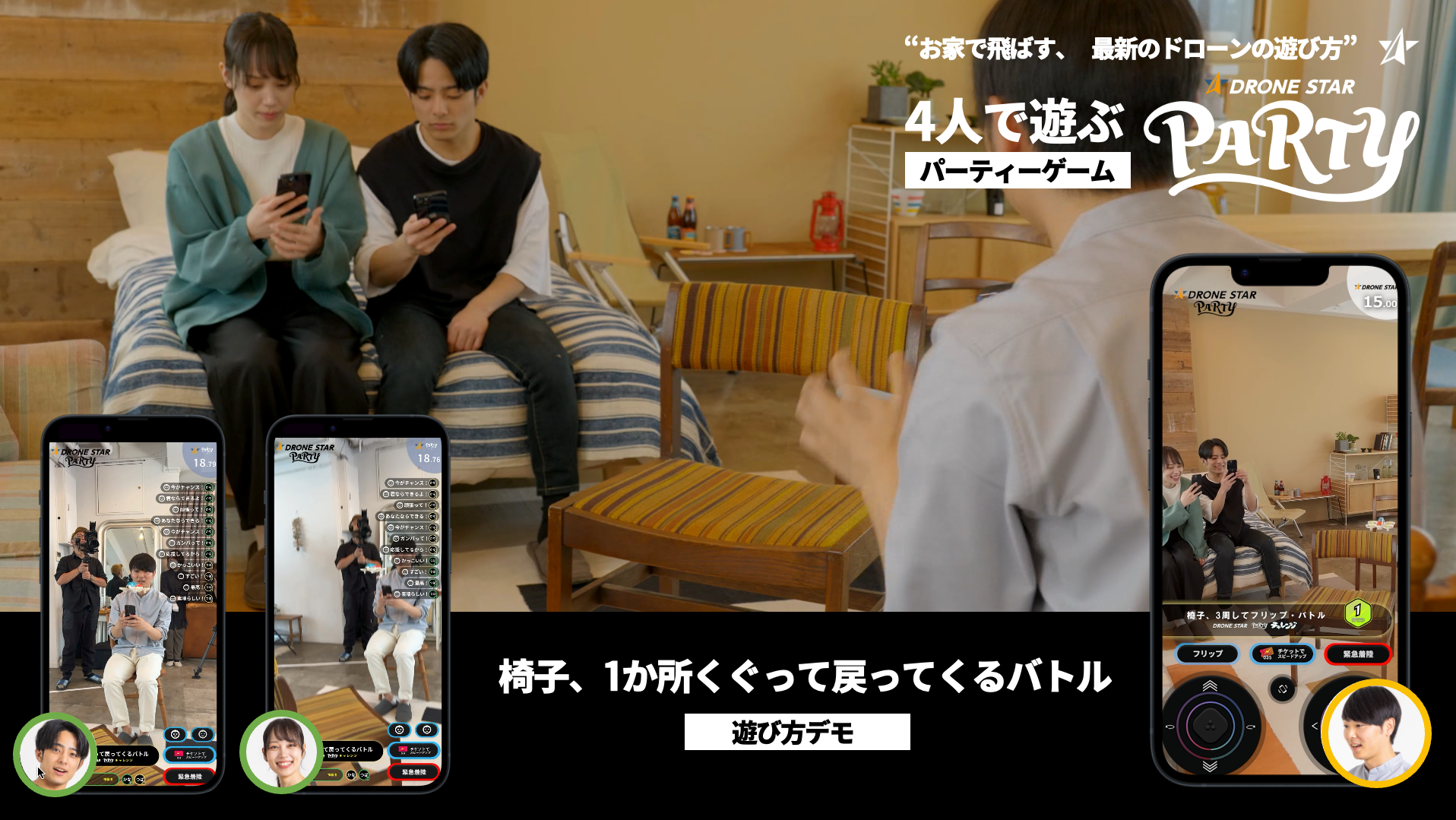 最大4人で楽しめるパーティゲーム「DRONE STAR PARTY」が登場しました。このアプリは、全て自動的にゲームを進めてくれるため、みんなで楽しく遊べます。ただし、1人では遊べないため、2人以上4人以下のスマホを持った友達と一緒にゲームを用意しましょう。「DRONE STAR PARTY」では、QRコードを使って簡単に参加でき、プレイヤールーレットで次に操作する人を決めたり、自動的にポイントランキングが表示されます。面倒な操作は一切なく、家で思いっきり楽しめるパーティゲーム、それが「DRONE STAR PARTY」です。