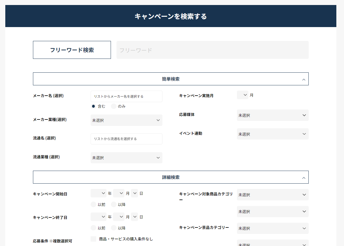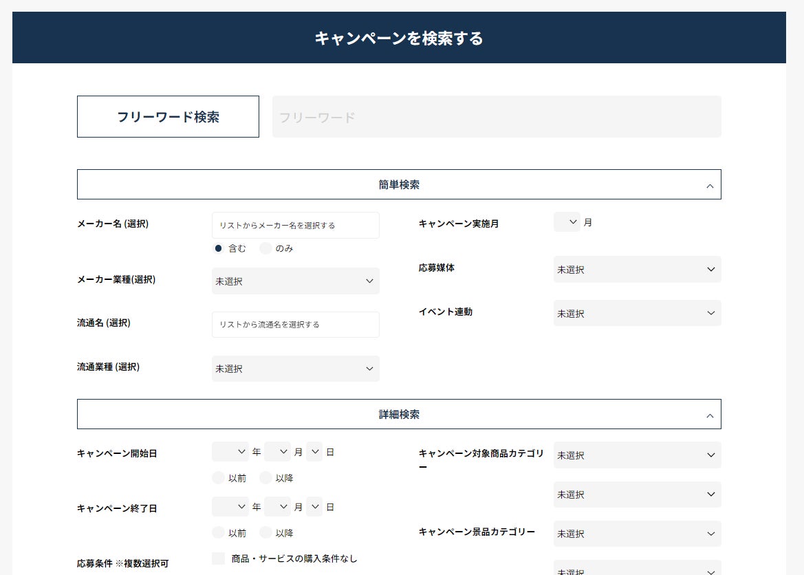 キャンペーンタイトルはもちろん、実施企業・実施期間・応募手法・応募条件、さらには景品の種類やクリエイティブのトンマナなどのセグメントでも検索可能です。