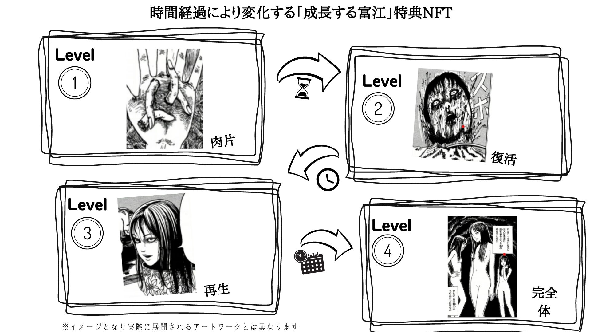 また、ただのNFTアートにとどまらず“富江のキャラクター性”を“NFTならではの技術で表現した”唯一無二の特典もご用意しております。