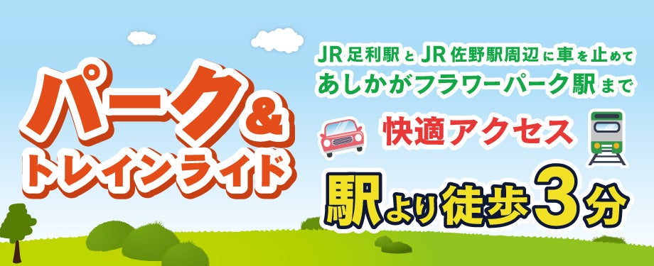 また、クリスマスシーズンの周辺道路の混雑緩和の為、JR足利駅・佐野駅周辺に無料駐車場を準備し、あしかがフラワーパーク駅まで電車移動していただく『パーク&トレインライド事業』もあわせて開催いたします。