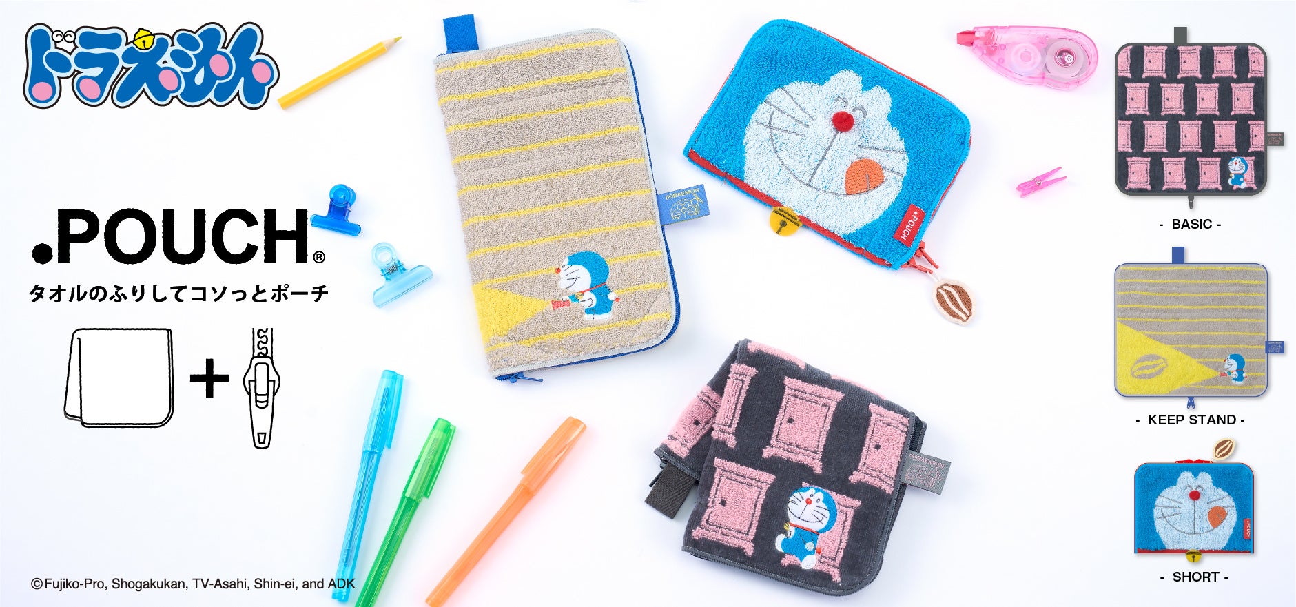 タオルのふりしてコソッとポーチの「どっとポーチ」に、ドラえもんデザインが新たに3アイテム登場!アイアップ公式オンラインストアで好評予約受付中。