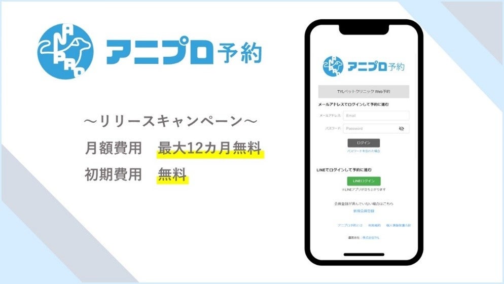 概要:アニプロ予約は動物病院向けの予約システムで、電話対応などの受付業務や予約台帳の記載の負担を減らすことを目的としております。ぜひ多くの病院に導入いただきたく、リリースキャンペーンとして【月額費用を最大12ヶ月無料】にてご提供を開始いたしました。