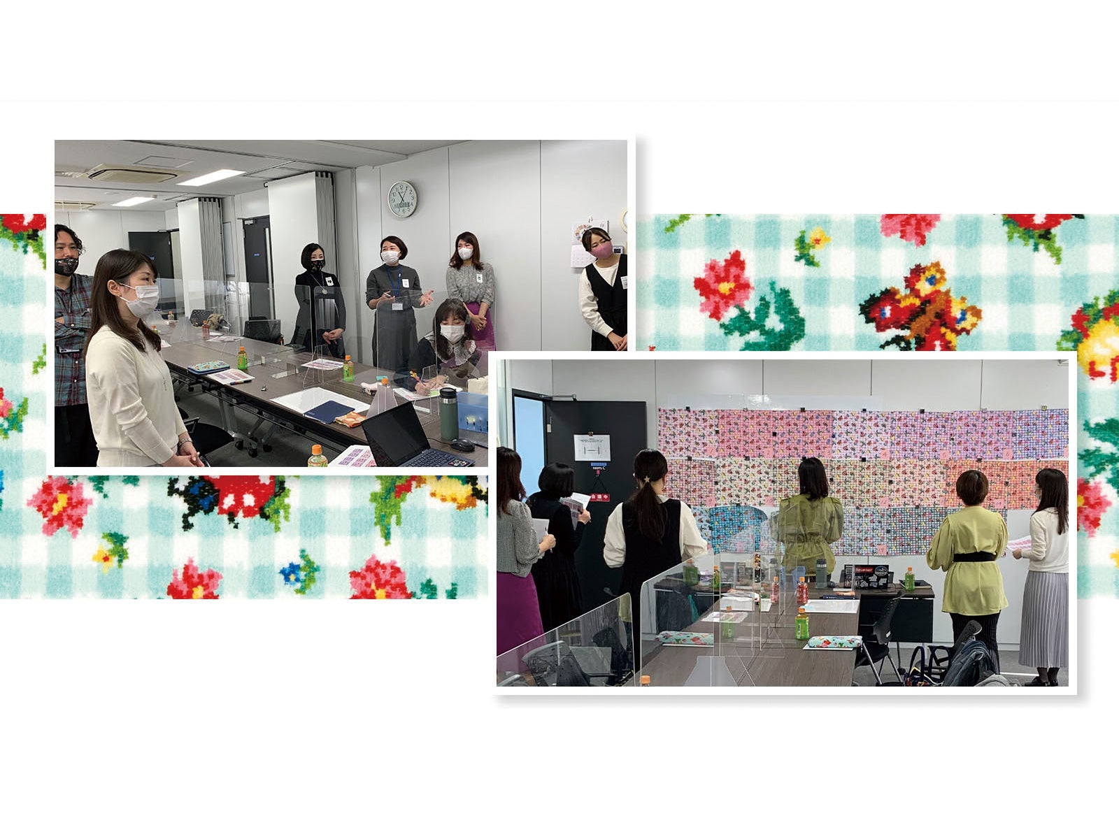 2021年9月にオンラインにておこなった第1回ミーティングでは、アンケート結果に基づいてデザインサンプルを見ながら、じっくりと検討。メンバーそれぞれが意見を出し合いながら、新しさや使いやすさなどを鑑みて、チェック柄を採用することに決まりました。