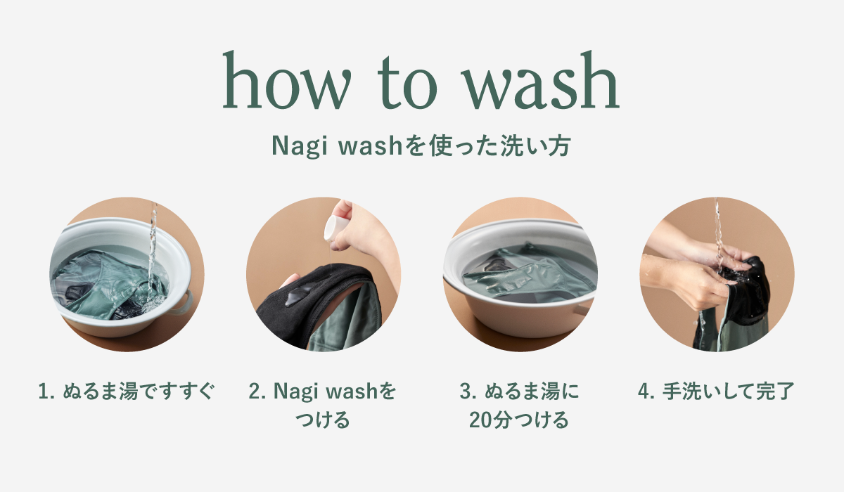 また、Nagi washは低刺激性の中性洗剤です。生地や手肌にやさしい洗剤なので、手荒れを気にせずお手入れすることができます。Nagiのショーツをより長くお使いいただきたい方におすすめです。