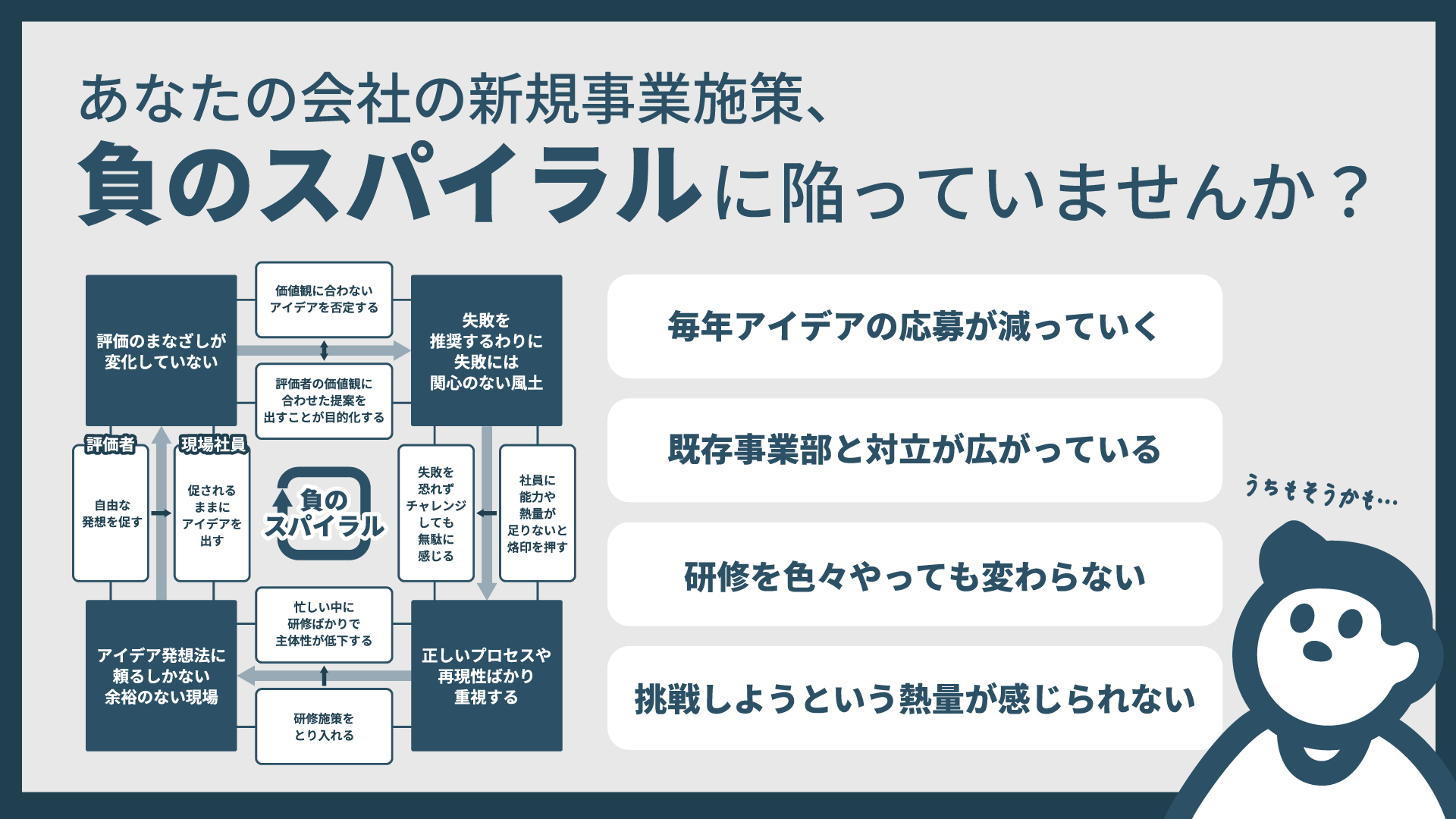 現代組織において、アイデアを生み出し実現する重要性は高まっています。しかし、新規事業施策を行っているものの「毎年アイデアの応募が減っている」「既存事業部との対立が広がってしまう」、そして「アイデアがなかなか実らない」というのが実情でしょう。そのような課題を抱える組織には、負のスパイラルが存在します。例えば、以下のようなことはないでしょうか。