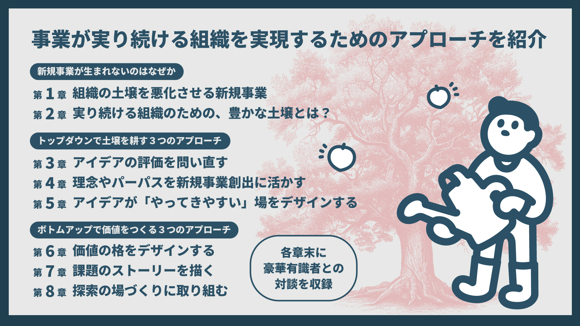 本書では、事業が実り続ける組織を実現するための6つのアプローチを紹介。各章末には豪華有識者(横石崇さん、徳谷柿次郎さん、佐渡島庸平さん、山田裕嗣さん、名和高司さん、安斎勇樹さん、ドミニク・チェンさん、守屋実さん)との豪華対談を収録しています。