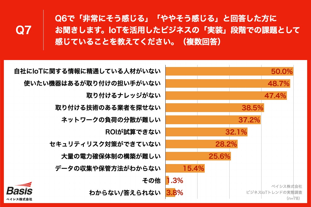 Q6で「非常にそう感じる」「ややそう感じる」と回答した方に、「Q7.IoTを活用したビジネスの「実装」段階での課題として感じていることを教えてください。(複数回答)」(n=78)と質問したところ、「自社にIoTに関する情報に精通している人材がいない」が50.0%、「使いたい機器はあるが取り付けの担い手がいない」が48.7%、「取り付けるナレッジがない」が47.4%という回答となりました。