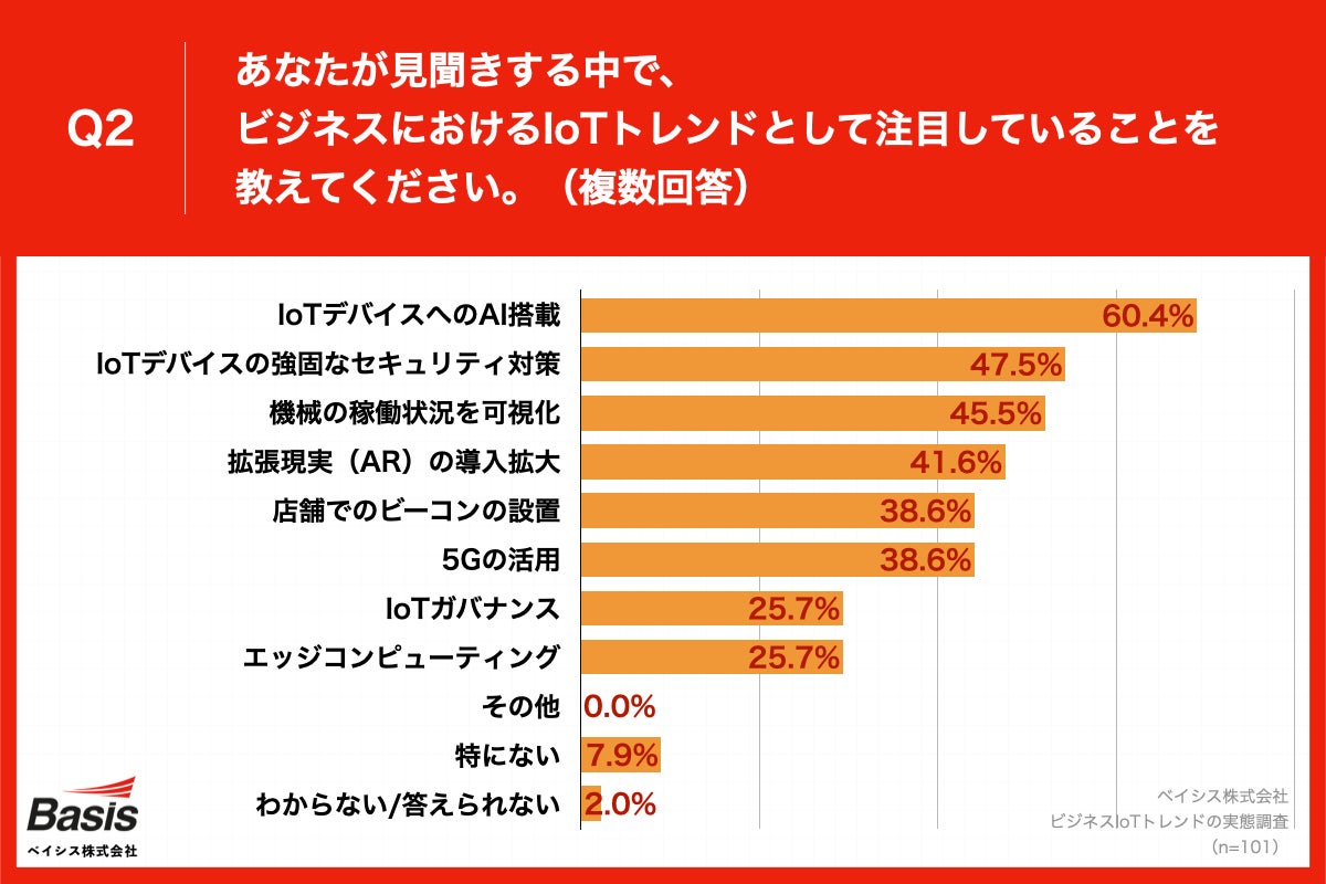 「Q2.あなたが見聞きする中で、ビジネスにおけるIoTトレンドとして注目していることを教えてください。(複数回答)」(n=101)と質問したところ、「IoTデバイスへのAI搭載」が60.4%、「IoTデバイスの強固なセキュリティ対策」が47.5%、「機械の稼働状況を可視化」が45.5%という回答となりました。