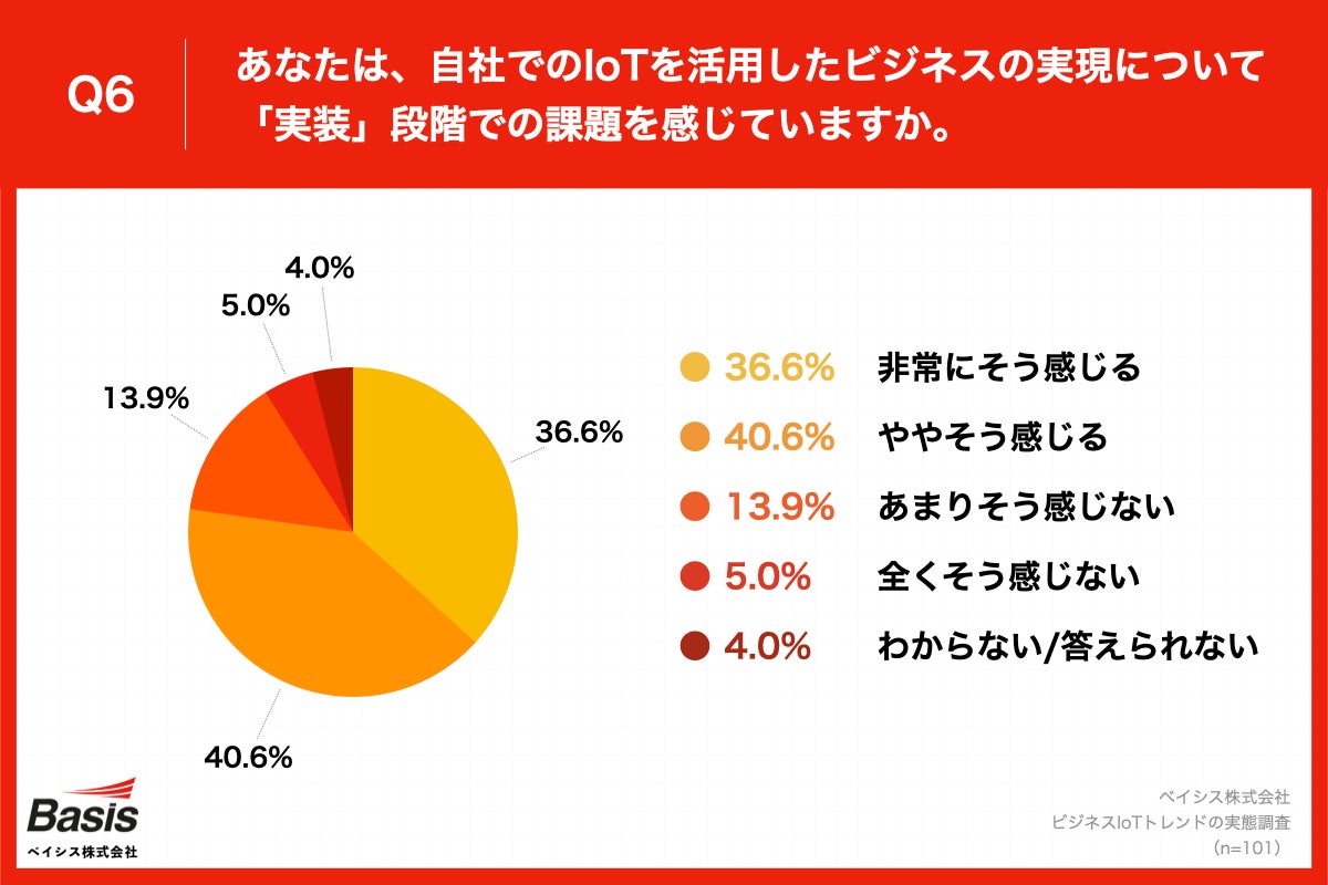「Q6.あなたは、自社でのIoTを活用したビジネスの実現について「実装」段階での課題を感じていますか。」(n=101)と質問したところ、「非常にそう感じる」が36.6%、「ややそう感じる」が40.6%という回答となりました。