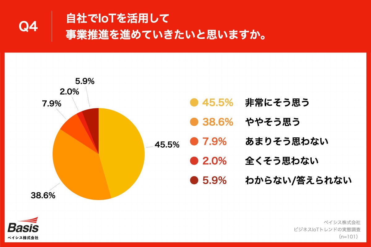 「Q4.自社でIoTを活用して事業推進していきたいと思いますか。」(n=101)と質問したところ、「非常にそう思う」が45.5%、「ややそう思う」が38.6%という回答となりました。