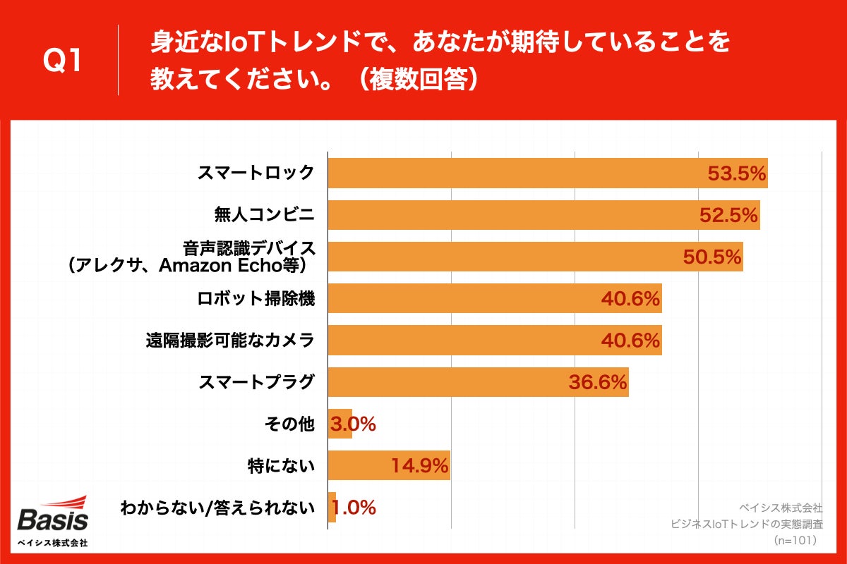 「Q1.身近なIoTトレンドで、あなたが期待していることを教えてください。(複数回答)」(n=101)と質問したところ、「スマートロック」が53.5%、「無人コンビニ」が52.5%、「音声認識デバイス(アレクサ、Amazon Echo等)」が50.5%という回答となりました。