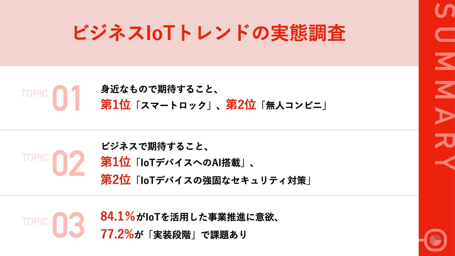 第1位「スマートロック」(53.5%)、第2位「無人コンビニ」(52.5%)という結果になり、また、ビジネスにおけるIoTトレンドとして、約6割が「IoTデバイスへのAI搭載」に注目している事が明らかになりました。
