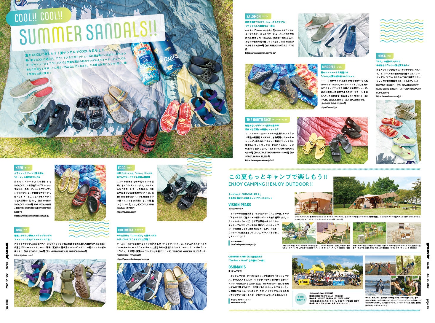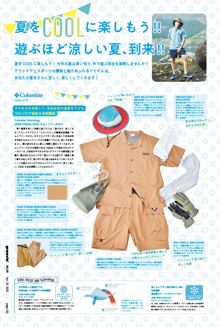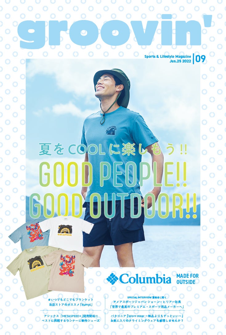「groovin'」スポーツライフスタイルマガジンは、夏をCOOLに楽しむ、機能性と魅力にあふれたアイテムが勢揃いしています。米国生まれのアウトドアブランド 「コロンビア」 独自の冷却機能「オムニフリーズゼロ」を採用した特別アイテムとともに、夏の大定番「サンダル」のスタイリングや、キャンプで大活躍のアイテムなどを紹介しています。このほか、注目のランニングシューズ「アシックス」の「メタスピード+」や、サステナビリティ(持続可能性)への取り組みなど、魅力的なコレクションと最新情報を是非ご覧ください!