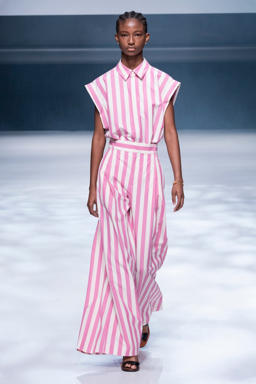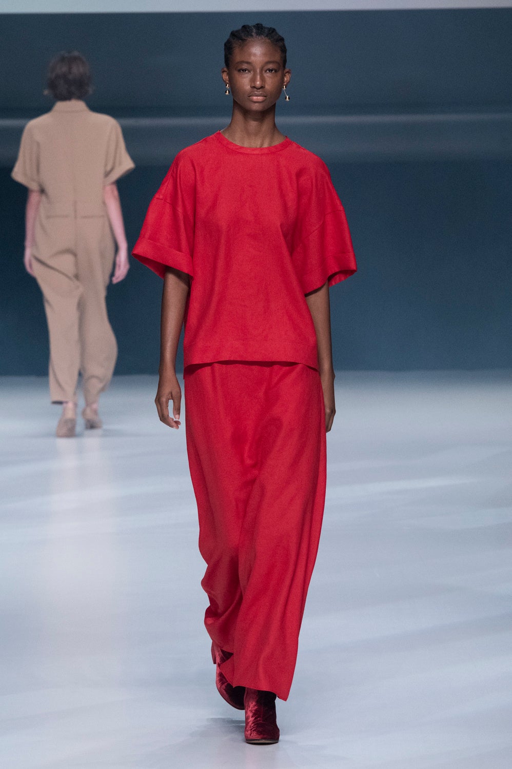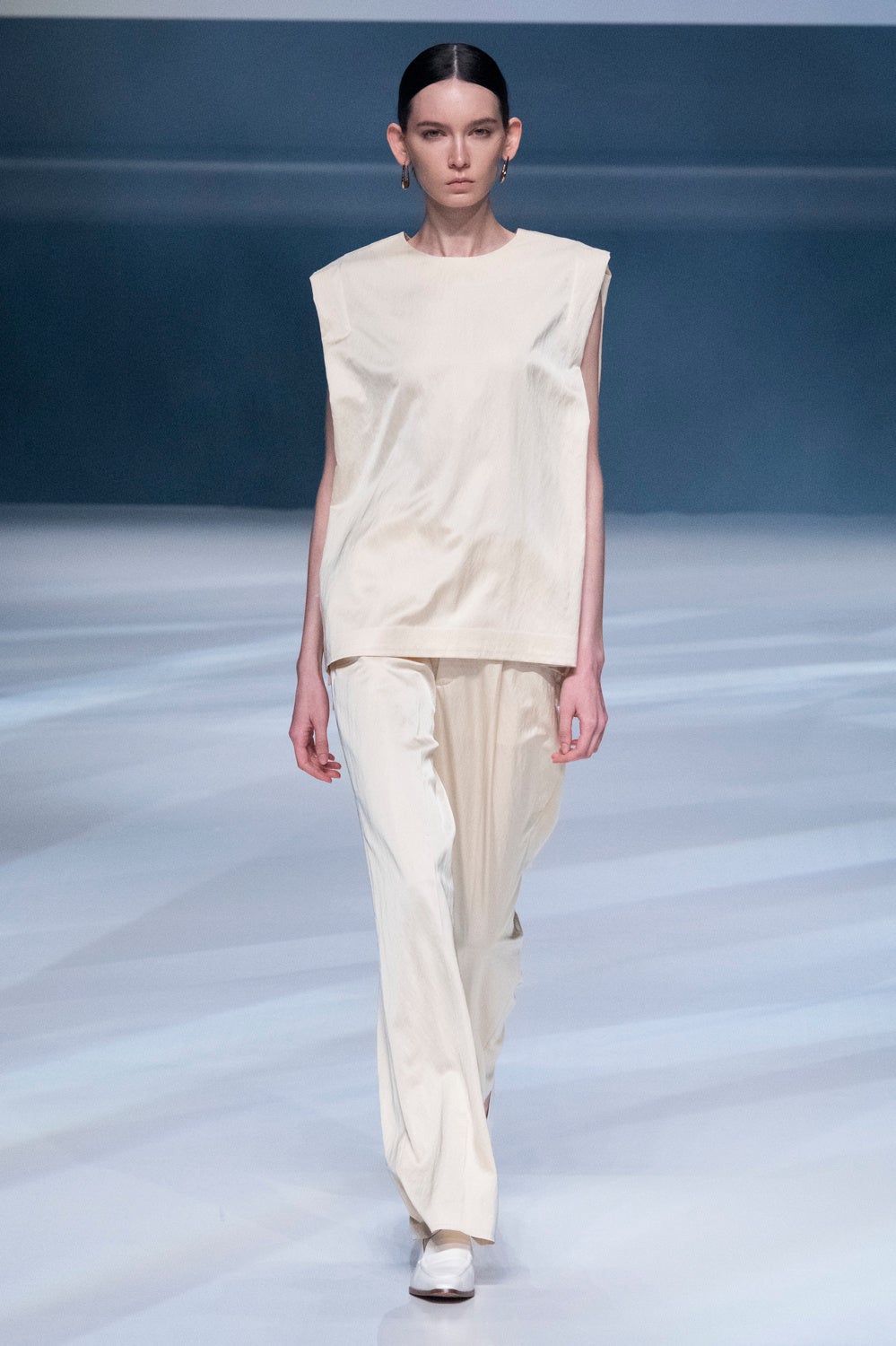 押さえた女性らしい柔らかくエレガントなスタイリングに、メンズテイストをプラスする独自な世界観が