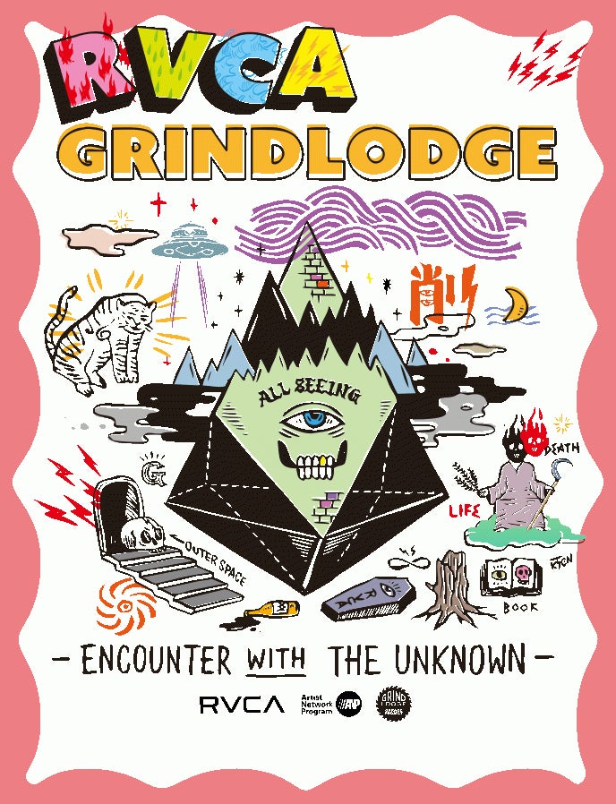 人類は、未知の存在、不可解な事象に遭遇すると、解明したい欲求に駆られる。それによってもたらされた成果は知識として現代まで蓄積されて進化を遂げて来た。まだまだ解明されていない事象をモチーフにする事により、同じ背景を持ちながらもそれぞれのブランドとして様々な道を探求してきた、RVCAとGRINDLODGEという二つのブランドが交わることによって起きるケミストリーの世界観を表現しています。