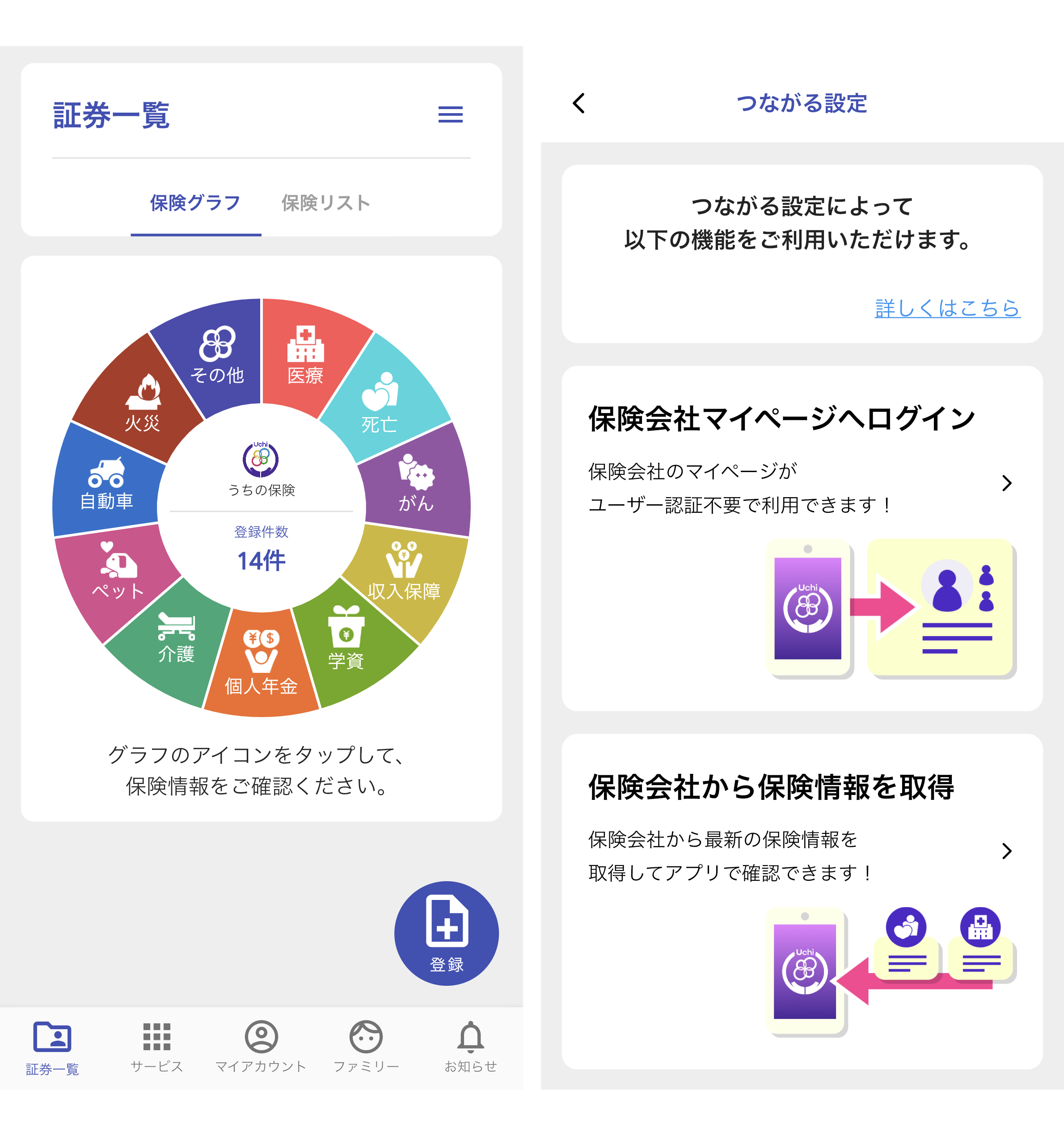 これにより、従来、うちの保険の保険情報を登録するときは、手入力かQRコードの読み取りが必要でしたが、より簡素な方法で保険情報を登録できるようになります。うちの保険があれば、つながる設定により、常に最新の保険情報をいつでも、どこでも簡単に確認でき、家族に共有できます。