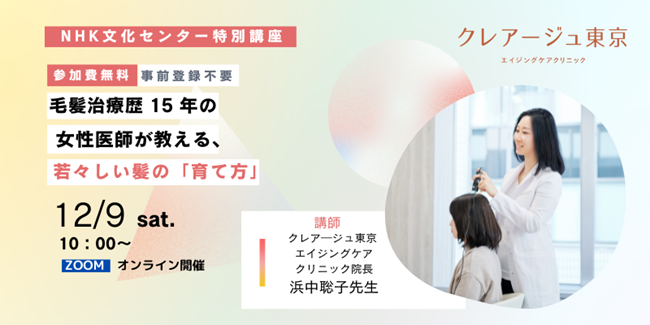 本講座は、NHK文化センターが主催するオンライン特別講座のひとつで、浜中院長は、頭髪・発毛治療歴15年の知見と診療実績から「若々しい『髪』の育み方」について講演を行います。