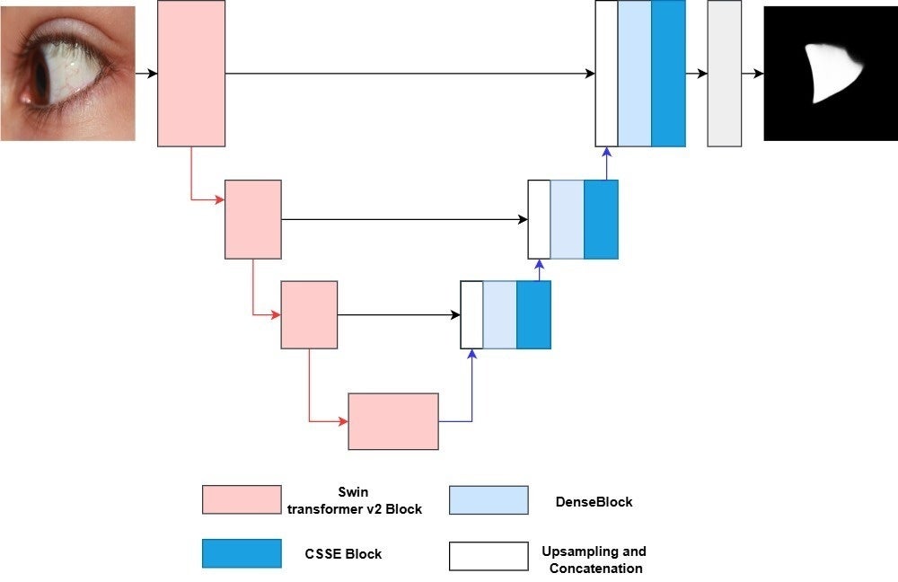 長距離依存関係を捉えるShifted Window Self-Attentionにより、白目のような微細な領域も高精度に認識。