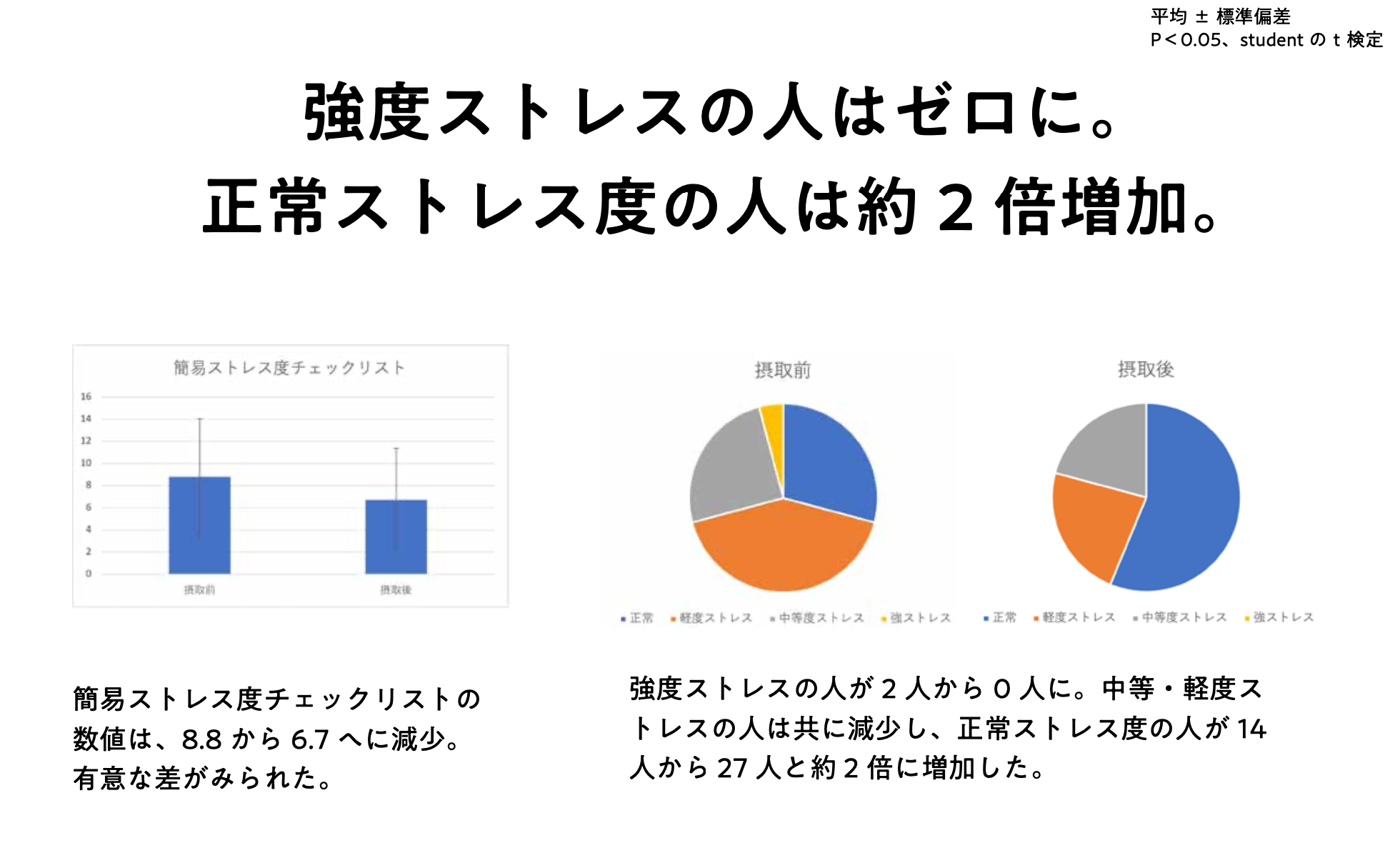 ストレスによっておこる不調が改善され、特に朝すっきり起きられるようになった、疲れが取れやすくなったという結果がみられました。全体的に、一定のストレスに対する適応力が向上し、ストレス耐久性が高まった可能性がある。
