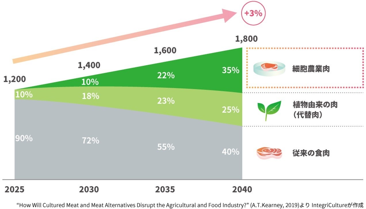 細胞農業の市場規模は、2040年には6,300億USドルまでなるとの予想が公表されています(図2:コンサルティング企業であるA.T. カーニー社による調査レポート)。当社では、細胞農業に関心を持たれた企業様がより簡便に参画できるように、勝手場への製品の出展を希望される企業様を募っております。