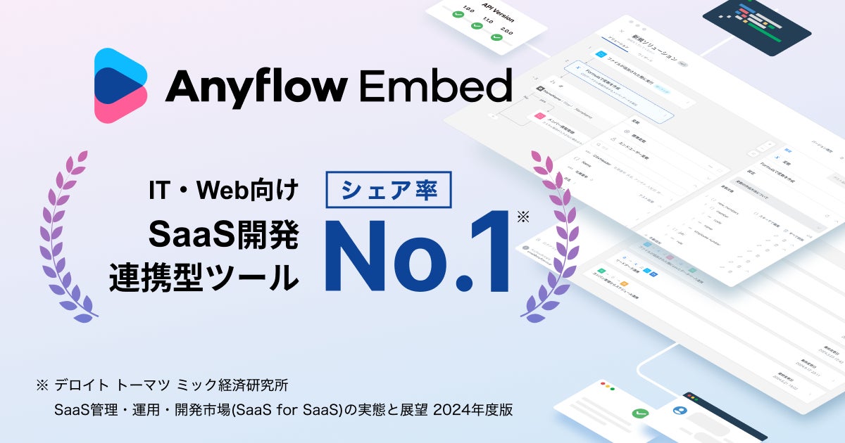 Anyflow株式会社(本社:東京都港区、代表取締役CEO:坂本 蓮、以下Anyflow)は、システム開発企業向けのAPI連携プラットフォーム「Anyflow Embed」は、デロイト トーマツ ミック経済研究所株式会社が発行する「SaaS管理・運用・開発市場(SaaS for SaaS)の実態と展望 2024年度版」においてIT・Web向けSaaS開発連携型ツールとしてシェア率No.1を獲得したことを発表いたします。