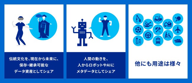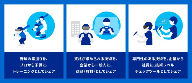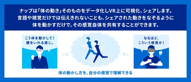 体の動きそのものを3Dデータ化し、様々な人へ共有できるようにするVRプラットフォームです。『ナップ』を活用すれば、モノを人から人にシェアするように、動きそのもの人から人へシェアできるようになります。録画した動画を「見る」のではなく、VR空間の中で実際に自らの体を使って様々なことを「する」ことができるVRであるため、どんな動きを誰から誰にどうシェアするかによって、様々な使い方ができます。