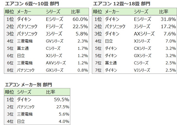 「12~16畳」部門では、3位のダイキンAXシリーズ、4位の日立XJシリーズと、除菌や防カビといった清潔機能を強みとした高級モデルが上位に食い込みました。