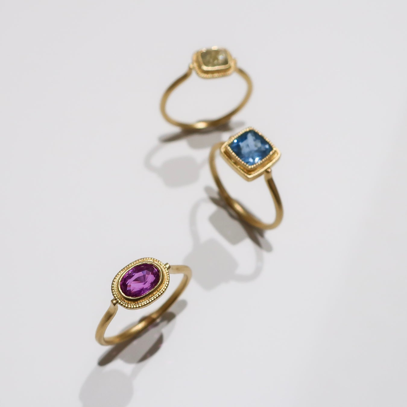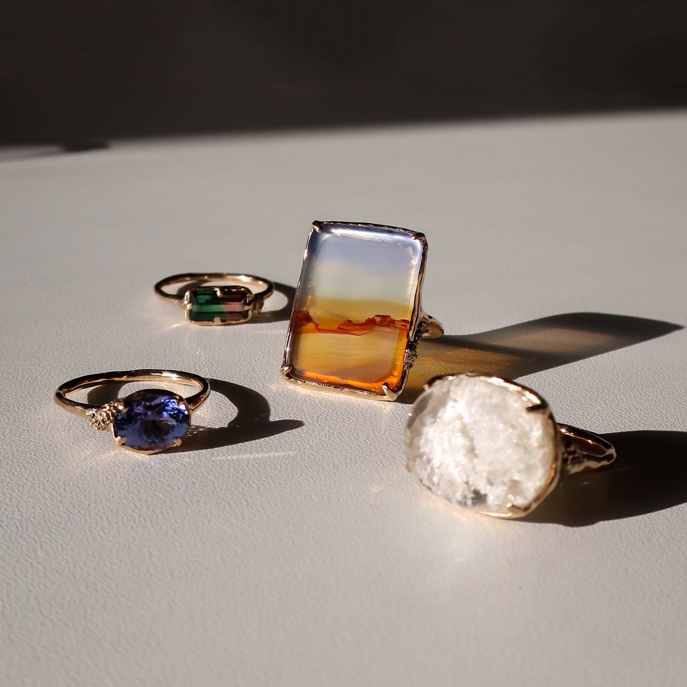デザイナーは寳神朝子。宝飾品としての宝石と鉱物好きとしての宝石、二つの視点から選んだ個性的な石使いや、ユニークな素材とその持ち味を活かしたデザインが特徴。天然石の魅力を引き出す、唯一無二の存在感を持つジュエリーです。