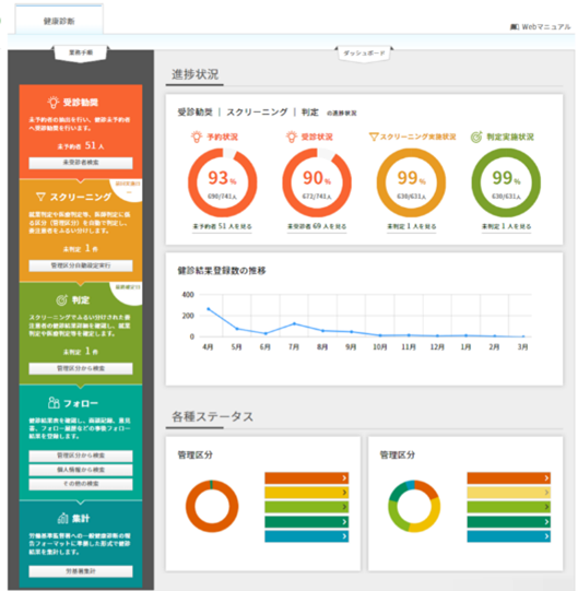 企業において従業員に対する健康診断の実施は労働安全衛生の観点から義務付けられています。また、健診結果は産業保健領域での健康増進・改善施策に向けた分析において重要な基礎データです。健康診断の受診促進とデータ管理は、データヘルス計画と健康経営優良法人認定の両面で非常に重要となります。
