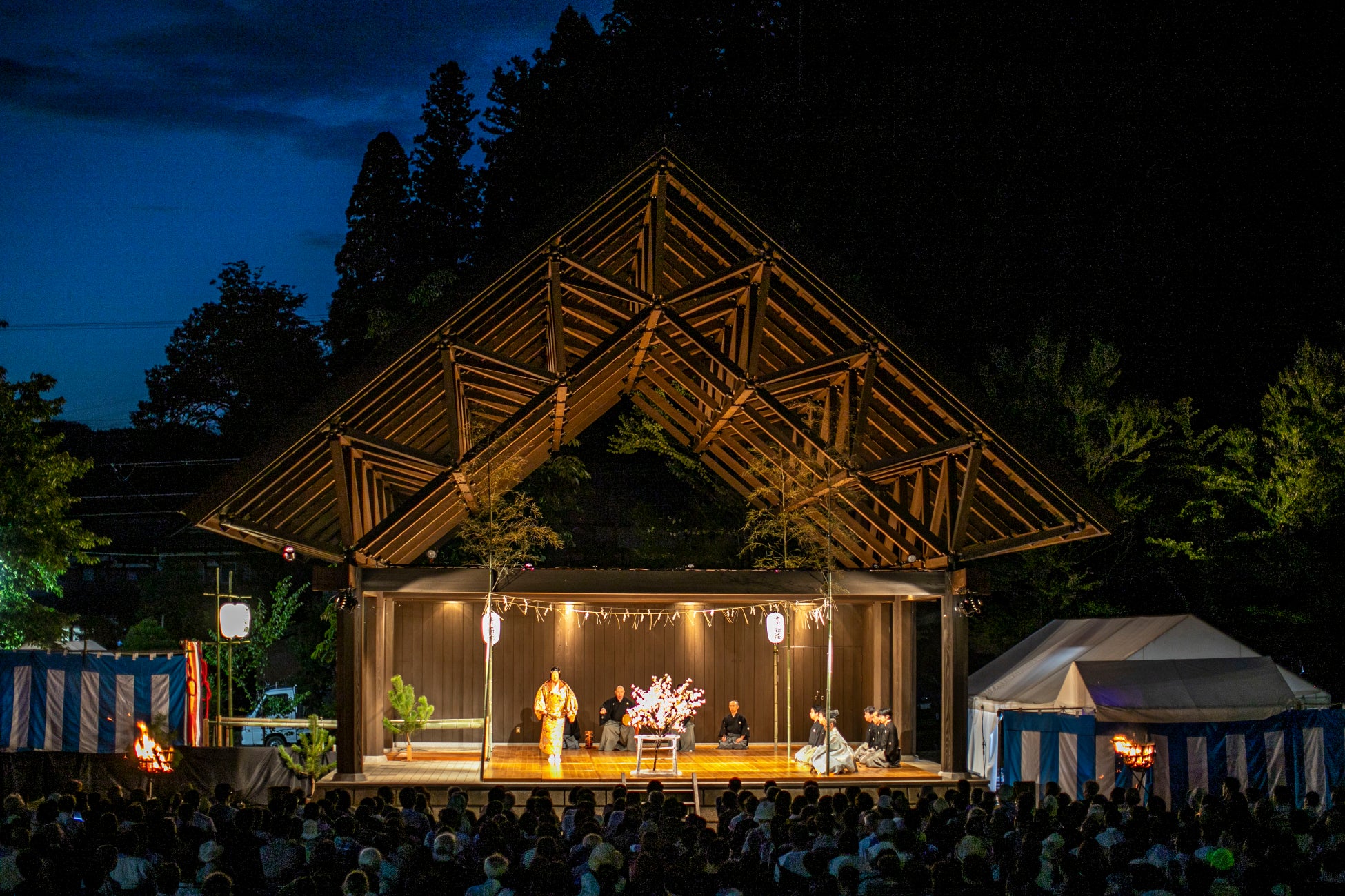 日本の伝統文化に触れる夏の一夜、760年の伝統を受け継ぐ地元10代の若き舞手も参加。人間国宝による競演で約800人の観客を魅了。