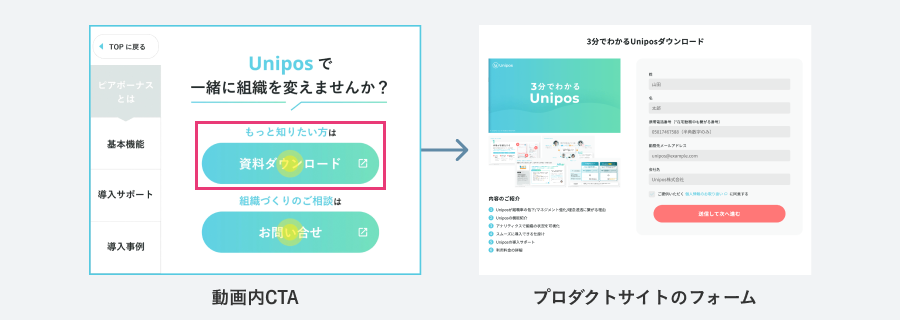 動画上に画像・テキスト・URLの情報を付与し、関連ページや詳細情報へ直接リンクができる機能です。Unipos社では、動画内から「資料ダウンロード」と「お問い合わせ」の画面にリンクさせ、申込が完了できるようにしています。この機能により、視聴後のコンバージョン率を高めます。