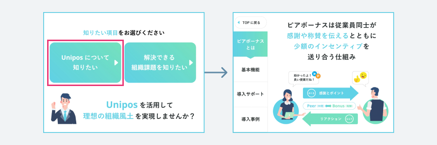 ●「Uniposについて知りたい」と「解決できる組織課題を知りたい」の2項目から、ユーザーが選択した項目に沿って各項目を解説。サービス理解と態度変容を促進。