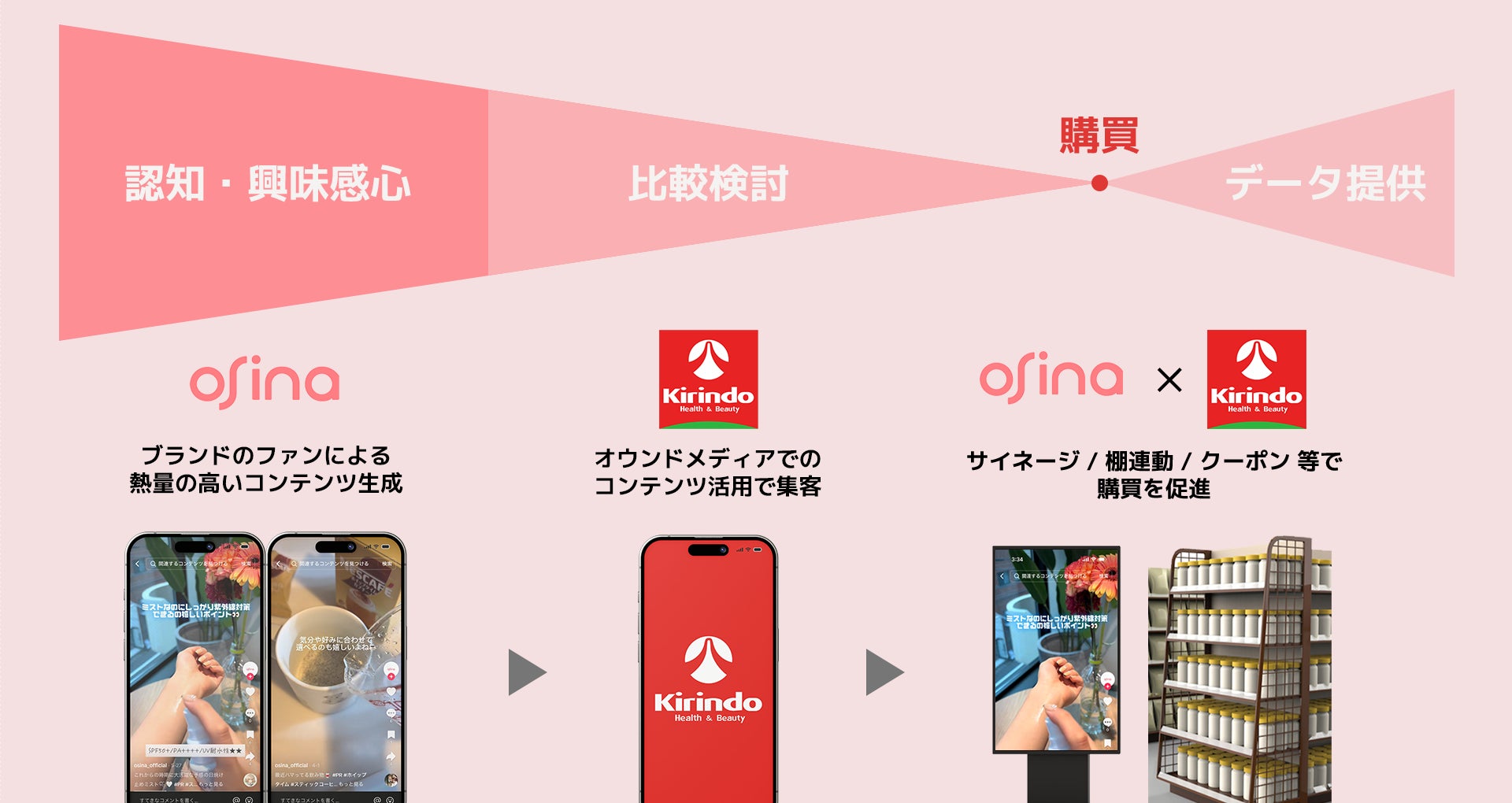 「osina Retail with キリン堂」は、キリン堂様保有の店舗、アプリ(オウンドメディア)、サイネージ等とosinaのブランドのファンが熱量高く紹介してくれる動画コンテンツを連携したプロモーションパッケージです。