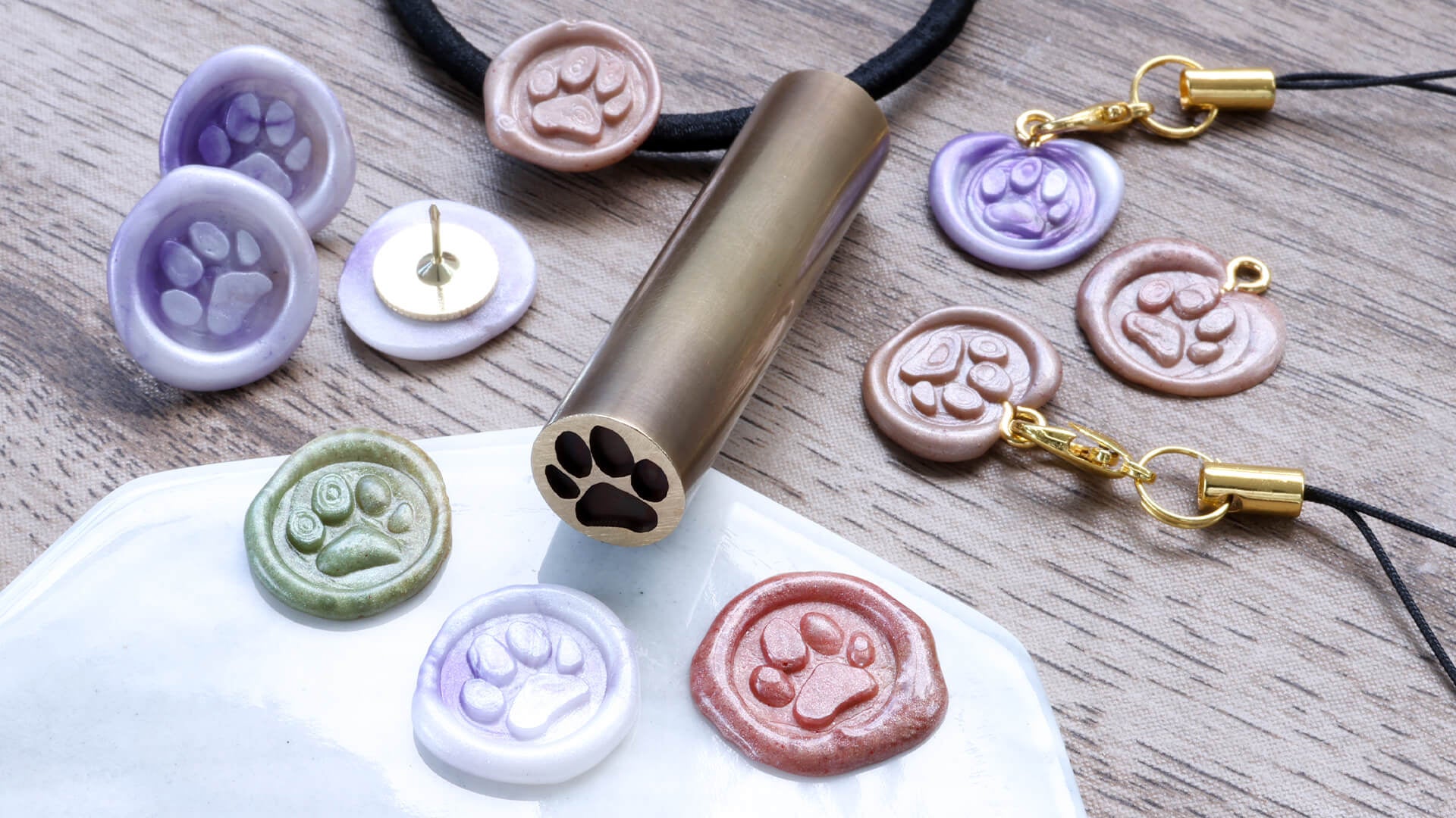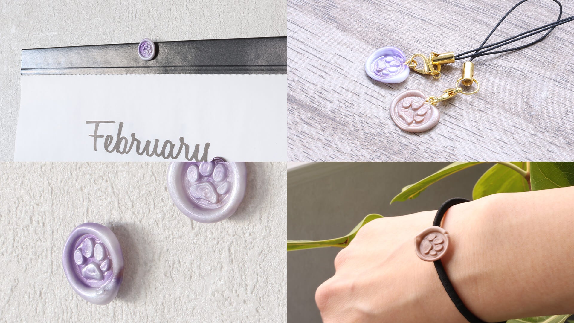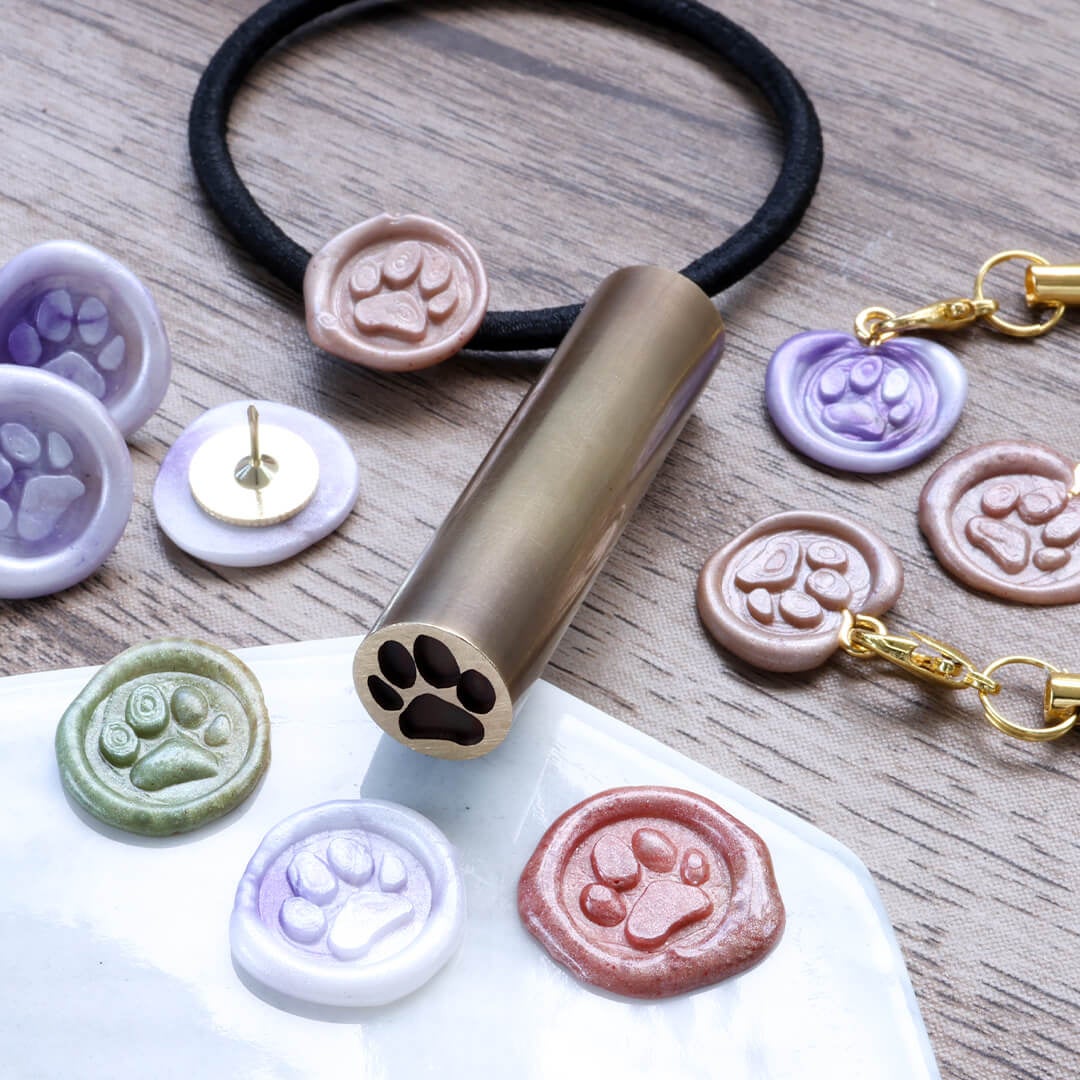 シーリングスタンプは封筒や書類の封緘に使われるアイテムですが、ラッピングやアクセサリーのアクセントとしても活用され、DIYやハンドメイドに持っていこいのアイテムです。散歩のポーチやカバンに付けるキーホルダー、カレンダーを貼る押しピンなど、愛猫・愛犬の肉球スタンプで、おしゃれな小物に簡単アレンジができます。