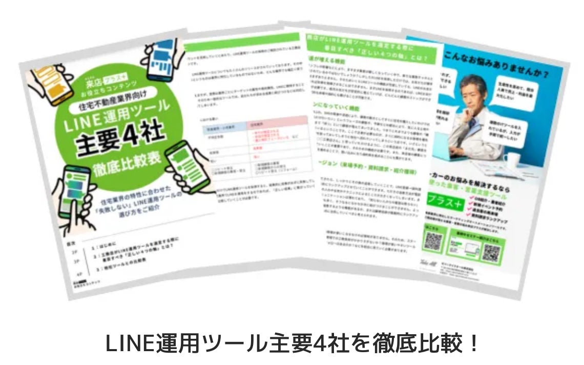 ギバーテイクオール株式会社(本社:東京都港区、代表取締役CEO 河野清博、以下当社)は、住宅・不動産業界向けLINE運用ツール《来店プラス》において、自社サービスを含む主要4社を徹底比較したレポートを配信することをお知らせいたします。