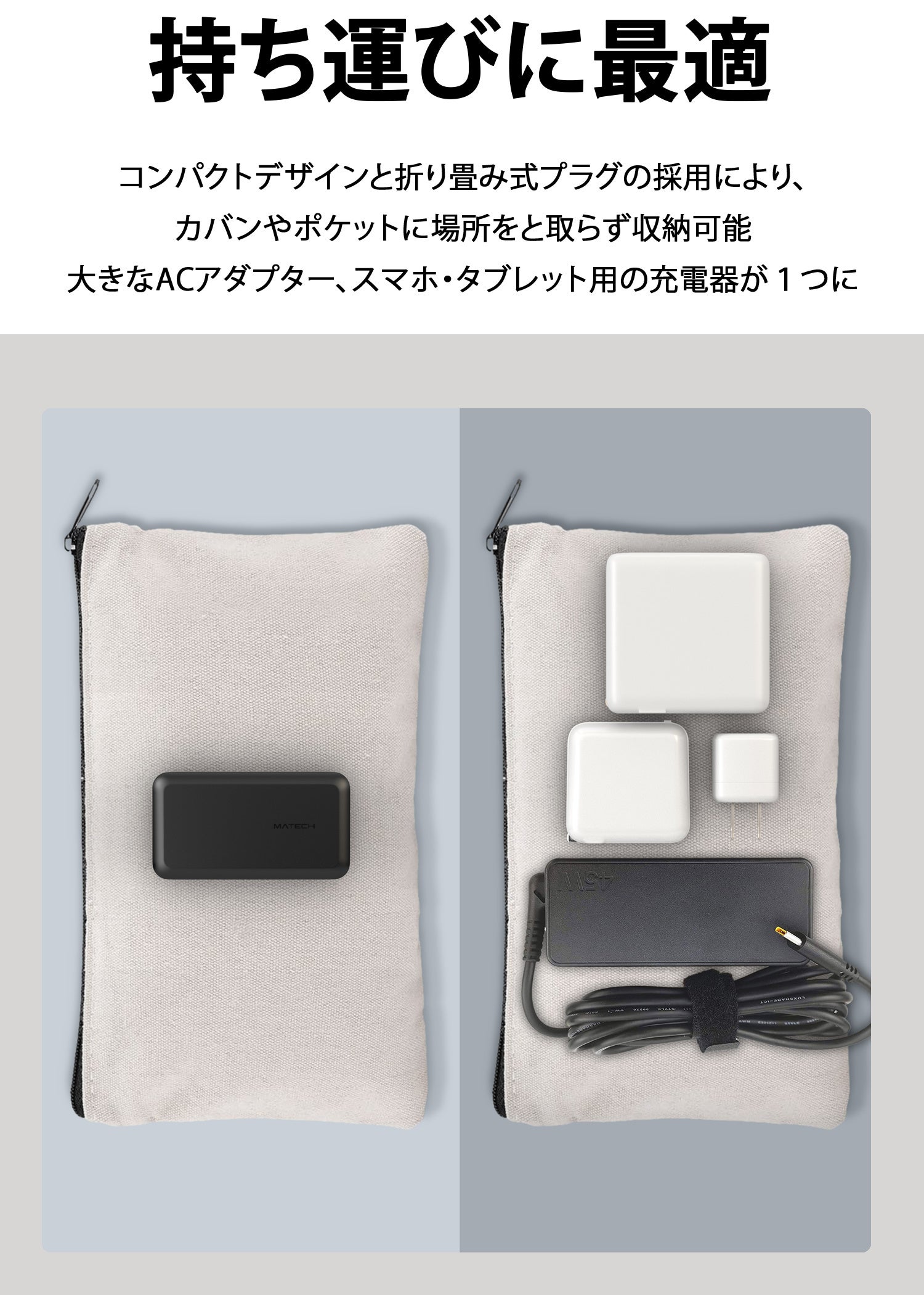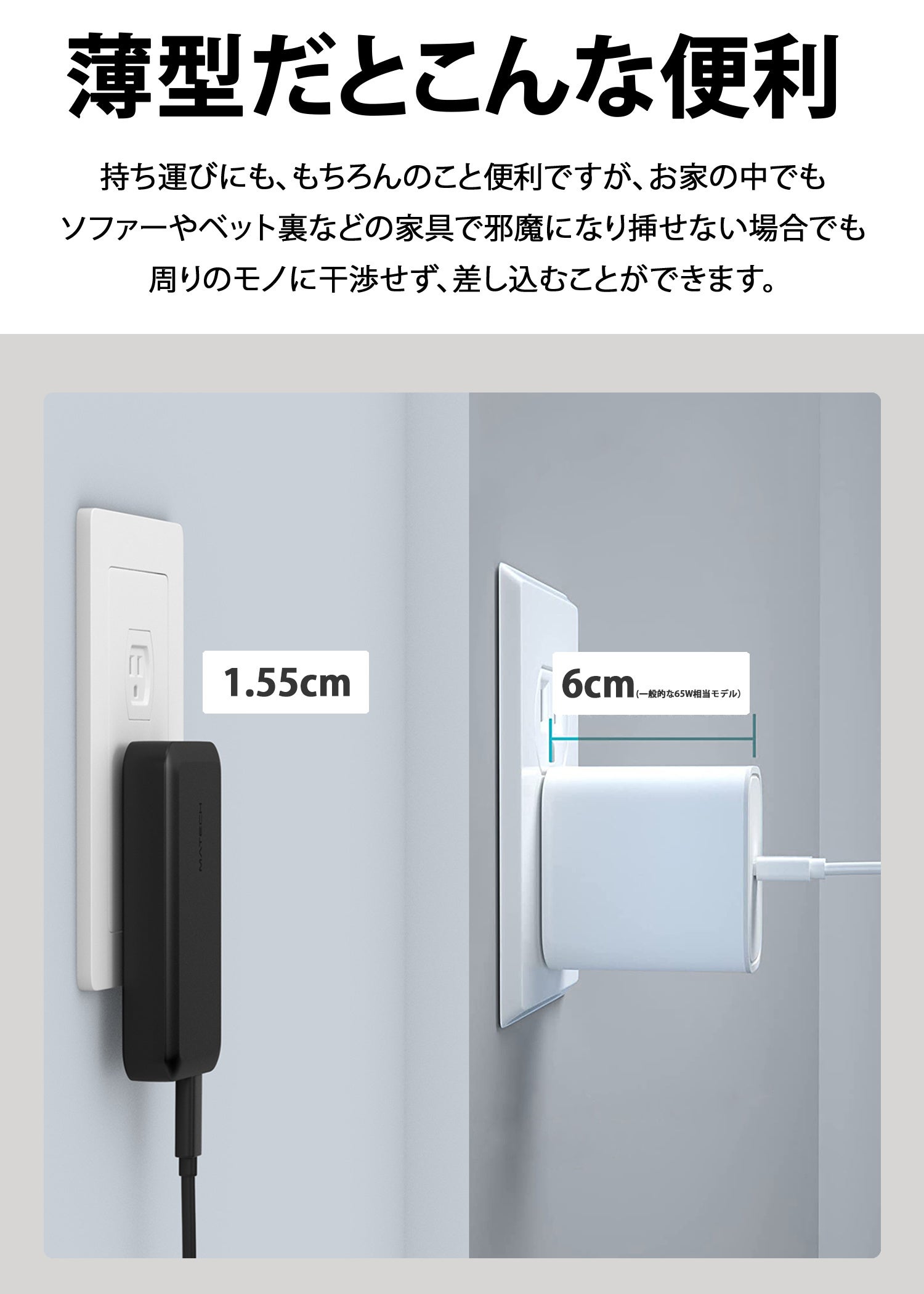 薄型充電器の中では、最高出力を誇る65Wのハイパワーを備えています。また、65Wクラスでは、最薄の1.55cmを実現しました。(※2022/4/27 MATECH調べ)