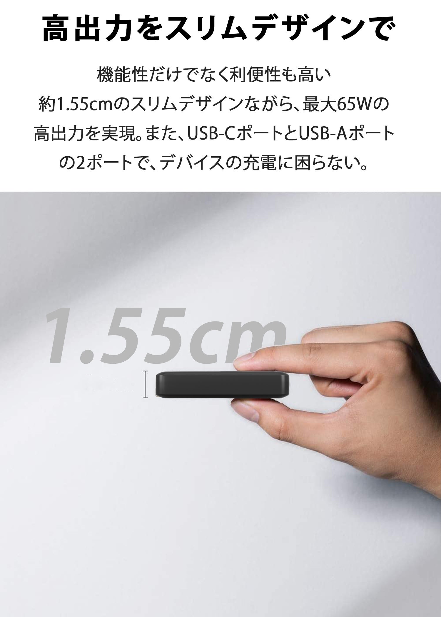 本製品は、次世代USB急速充電器シリーズの中でも抜群の利便性とコンパクトさを兼ね備え、65Wクラスの充電器の中では、最薄、最軽量のモデルとなります。また、薄型充電器では、最高出力の65Wを実現しました。次世代パワー半導体素材「GaN」を採用し、約90×48×15.5mmという薄型&コンパクト設計ながら最大65Wの高出力を実現しました。USB Power Delivery(以下USB PD)やQualcomm®︎ Quick Chargeなどの充電規格と互換性のあるUSB Type-Cポート(以下USB-C)を備えているので、MacBook ProやThinkPad等のUSB-Cポートを搭載したノートPCから普段お使いのスマートフォンまで、この一台でほとんど全てのUSB-C対応機器をフルスピード充電できます。