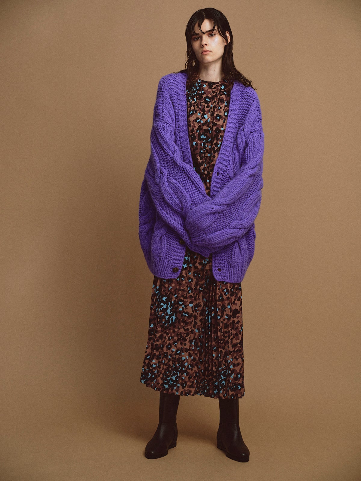 ブラウンとサックスのカラーミックスが美しいオリジナルのレオパード柄を使用したフェミニンワンピースに、一枚一枚ハンドメイドで仕上げたリッチなカーディガンをオン。歩くたびに揺れる軽やかなシルエットのワンピースと、イタリア糸ならではの発色を活かしたカラーカーディガンで秋冬を彩ります。