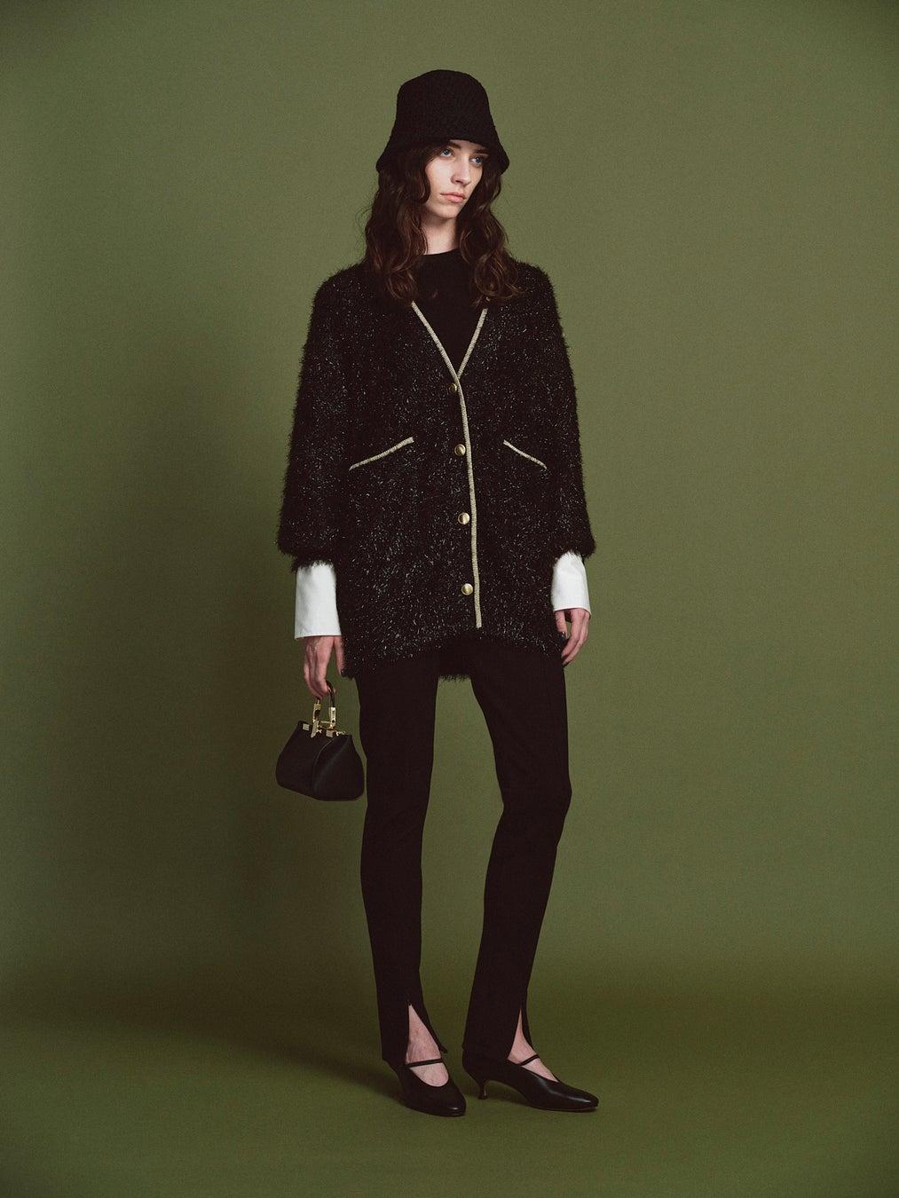 今期トレンドのシャギー感とキラキラ感を反映したニットカーディガンを主役に、シンプルにまとめるのがおすすめ。前立てはゴールドのコイルヤーンでチェーン風にパイピングし、シャギーのキャッチーなムードを大人っぽく締めるアクセントに。
