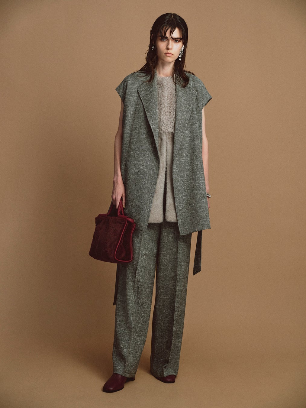 ゆるやかなトライアングルカラーがベルテッドのデザインとマッチして、スタイリングに抜け感をプラスするセットアップ。ツイーディな表情を持ちながらウールが入っていない素材なのでシーズンの初めからご着用いただけます。マニッシュなジレミックスのスタイリングを楽しんで。
