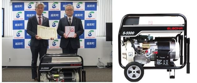 当行と株式会社RCG(代表取締役 天間 幸生)が連携するビジネスマッチング業務を通じて、柴田商事株式会社(本社:福井県福井市 代表取締役社長 柴田 達宏)より、福井県越前町の「まち・ひと・しごと創生推進計画」の「時代にあった地域をつくり、安心なくらしを守るとともに、地域と地域を連携する事業」に、発電機(商品名:エルソナ)の寄附が行われましたのでお知らせいたします。