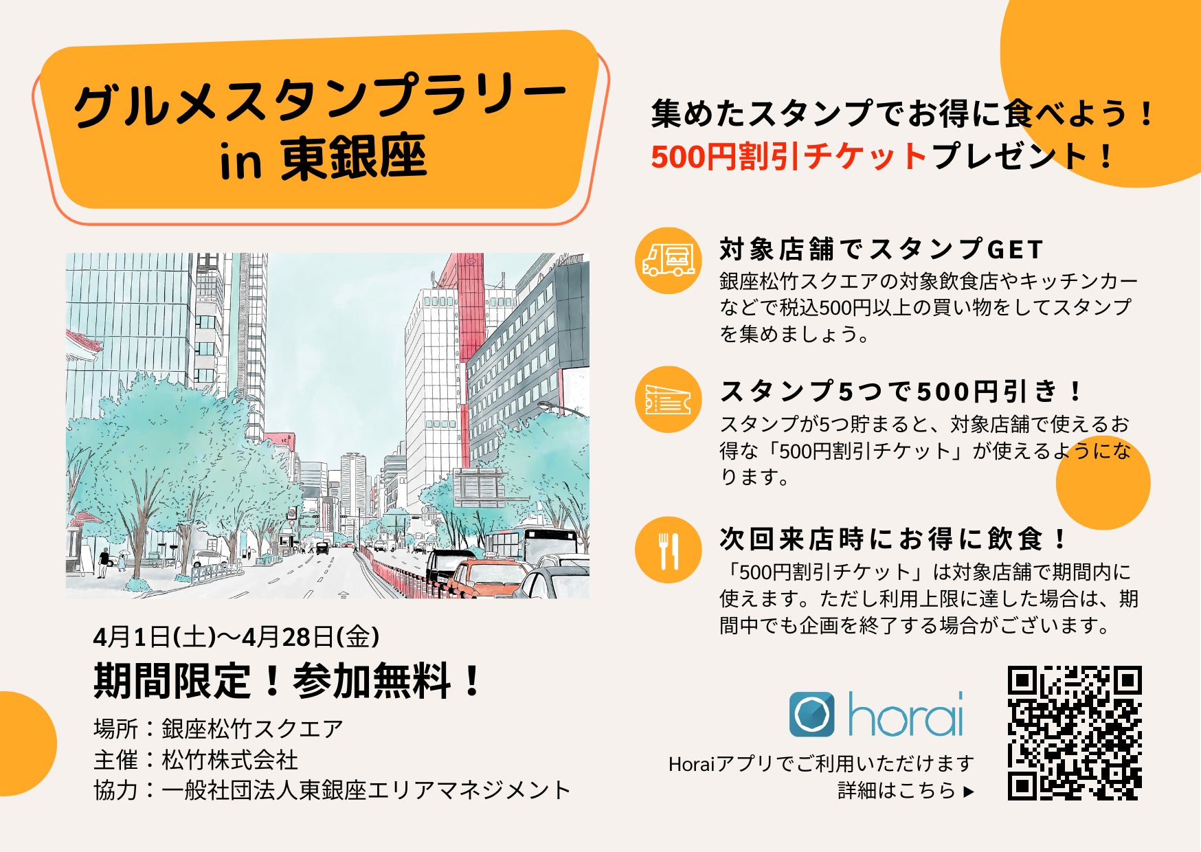 scheme verge株式会社と松竹株式会社は、一般社団法人東銀座エリアマネジメントと協力して、「グルメスタンプラリーin東銀座」を2023年4月1日から4月28日まで銀座松竹スクエアで開催いたします。対象飲食店やキッチンカーなど18店舗で税込500円以上の買い物をしてスタンプを集めると、500円の割引チケットがもらえるオトクなスタンプラリーとなっております。