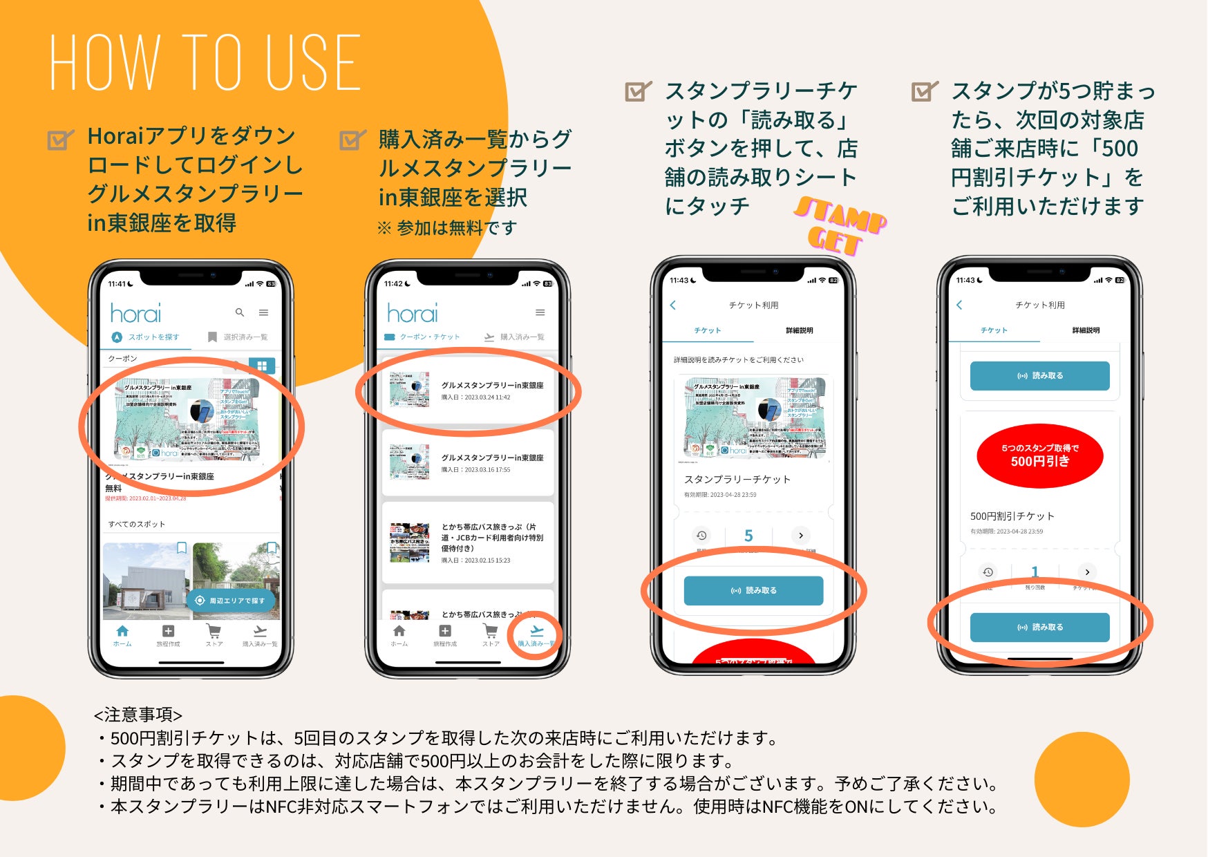 ご利用にはスマートフォンアプリ「Horai」が必要です。お手持ちのスマートフォンにHoraiアプリをダウンロードして、「グルメスタンプラリーin東銀座」を取得してください。