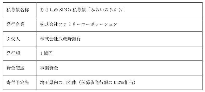 株式会社ファミリーコーポレーション(本社:東京都中央区銀座、代表取締役:冨吉範明)は、2025年2月25日、株式会社武蔵野銀行(本店/埼玉県さいたま市、取締役頭取/長堀 和正、以下「武蔵野銀行」)が提供する「むさしのSDGs私募債『みらいのちから』」により1億円の資金調達を実施いたしました。調達した資金は事業資金として活用いたします。