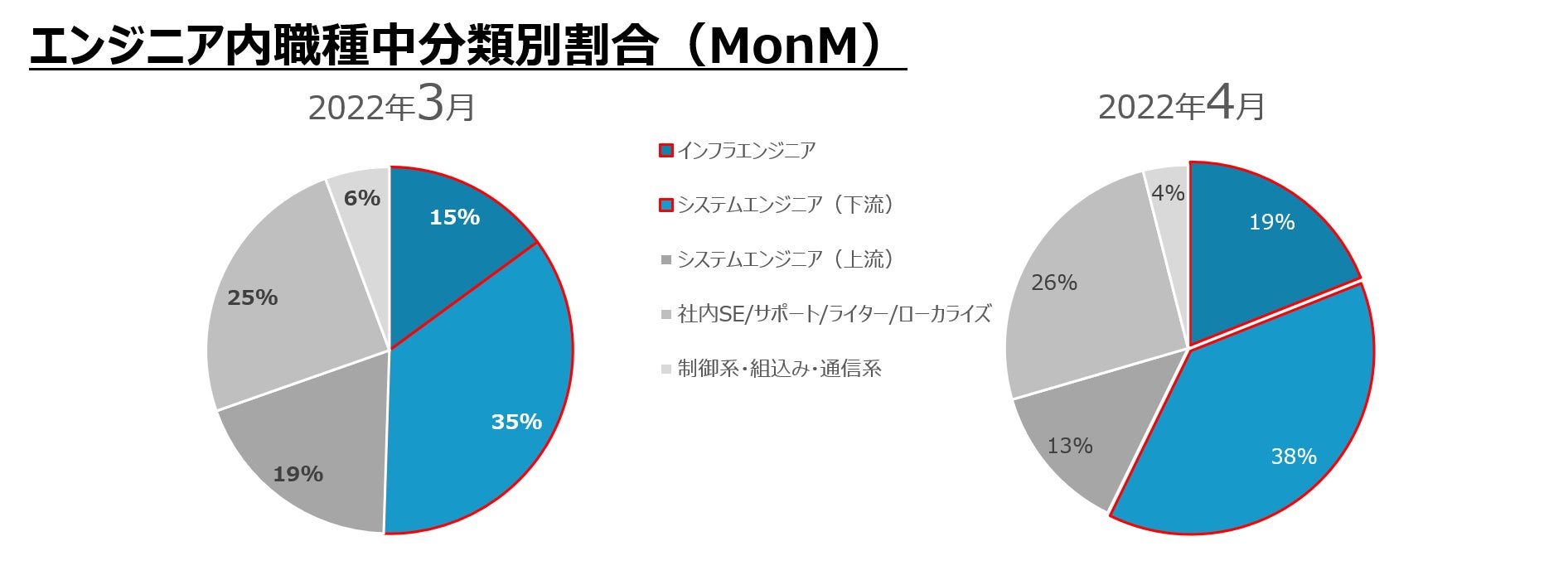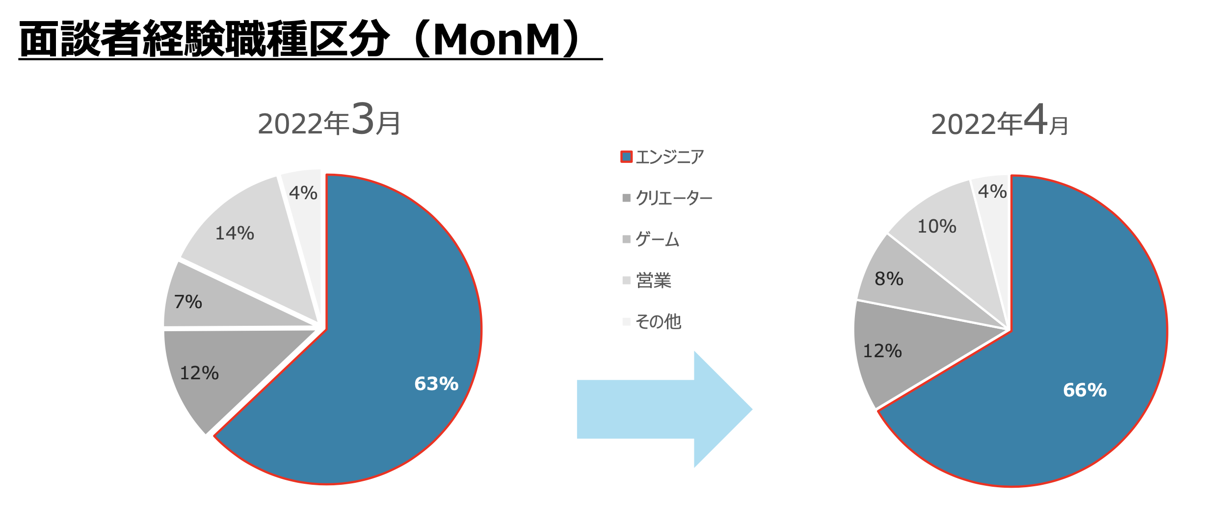2022年4月面談者の経験職種を区分した結果、先月に比べエンジニア比率が3.2%増加し、過去最高値を更新しています。