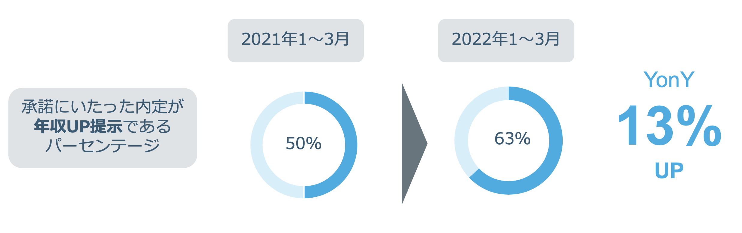 1年前に比べ、内定承諾となった求職者の提示年収が、現年収より高い条件提示であるケースが引き続き増えています。