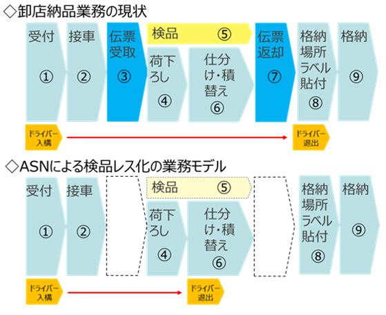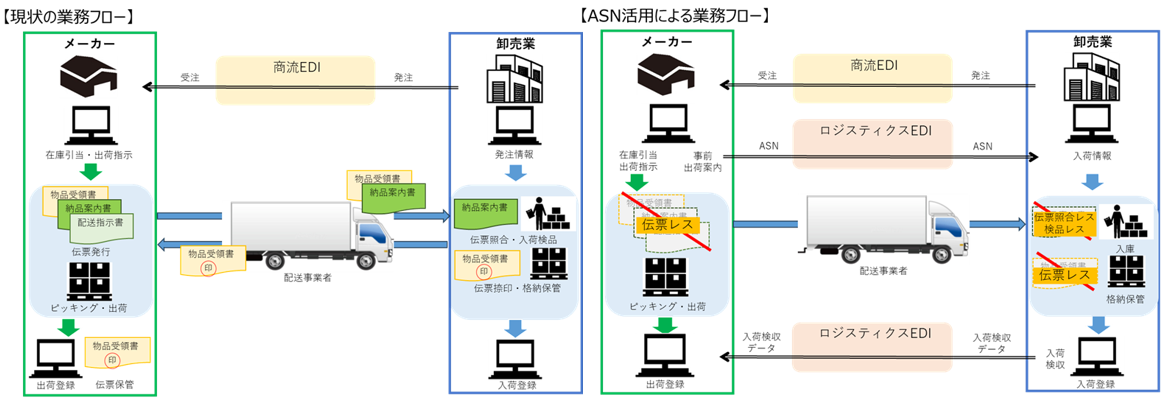 ASNを卸売業に配信することで、納品時の検品作業の簡素化や紙伝票の電子化が進み、荷受け作業の時間が短縮でき、物流における労働生産性の向上と物流資源の効率化が実現します。また、ASNを始めとする個々の物流取引情報がデジタルデータ化されることにより、サプライチェーン全体の輸配送や在庫の最適化の推進が期待できます。