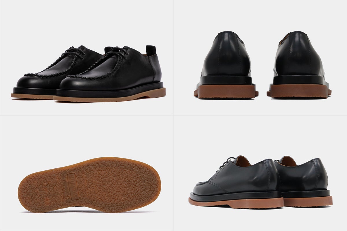 最高級のフルグレインレザーをアッパーに使用し、存在感のあるラグジュアリーなモデル。丁寧にハンドステッチされた太めのステッチと、革巻きされたミッドソール+ラバーアウトソールでダブルソールが、モード感あふれるデザインになっています。